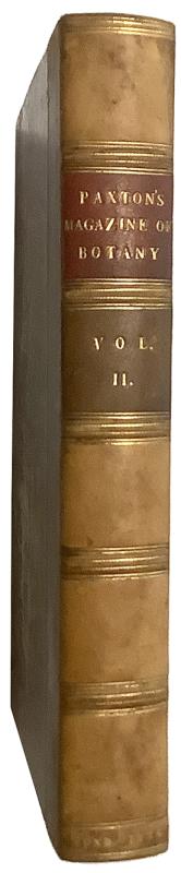 PAXTON, Joseph. Paxton’s Magazine of Botany, and Register of Flowering Plants. Volume the Second. xii, 270, [6]pp index., half-title., 43 fine hand coloured botanical plates (5 double page),with good strong colour, and numerous text woodcuts. A very good clean copy bound in contemporary half calf, marbled boards, gilt labels. Some rubbing to the binding, and evidence of the removal of a private book-plate. The plates are a selection of those listed in the Latin and English index.