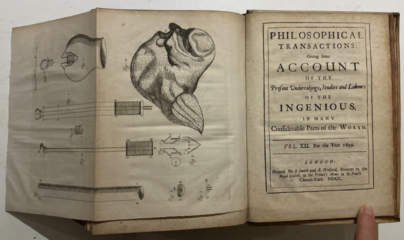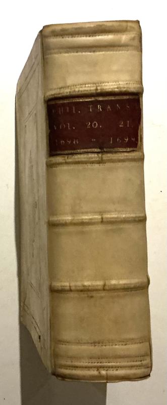 Philosophical Transactions giving some account of the present undertakings, studies and labours of the ingenious in many considerable parts of the world. Vol XX for the years 1698. [BOUND WITH] Vol XXI for the years 1699. Numbers 236-259. Prelims to Vol XXI bound before page 407 [ie before issue 259]. Errors in pagination to Vol XXI, but text continuous. First edition. 4to. Vol XX Pp [iv], 468 [iv], 10 plates and two folding tables. Vol XXI [vi] 442 [vi]. 11 plates and two folding tables. Bookplate of N Vansittard to front paste down, booklabel Winnard s bequest Free Public Library to front pastedown. Twenty four issues, complete of these early two volumes, rare so. Amongst the important articles in these issues are the first description of an effective steam pump: An Account of Mr Savery s Engine, for raising water by the help of fire (issue 253). They contain also amongst many others a dissection of the American opossum from Virginia by Tyson (issue 239), a method of extracting the root of an infinite Equation by Moivre (issue 240) a description of a triple rainbow by Halley (issue 240), observations on Giants Causeway (issue 241), some thoughts on vegetation by John Woodward (issue 244), a description of Loch Ness, explaining how deep it is [but, alas, no mention of the monster] (issue 254), correspondence between Wallis and Leibnitz (issue 255), a discourse on coffee by John Houghton (issue 256), A calculation of the credibility of human testimony (issue 257), on the discovery of the bulbourethral glands by Cowper (also known as Cowpers glands), and also a letter by Benjamin Woodroose concerning several observations in Maryland (issue 259). They also contain an objection to Leeuwenhoek s assertion on the generative properties of male semen by Dr Lister (issue 244), and Leeuwenhoek s reply (in issue 255), in which there are two articles from him: i) containing his answers to objections made to his opinions, and ii) concerning the Animalcula in Semine humano, in which he argues from his own experimental researches that the shape of sperm does not resemble a homunculus.