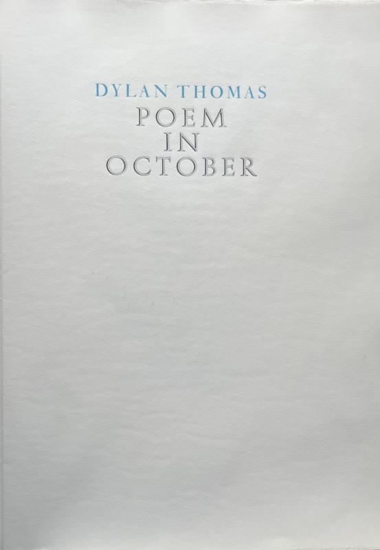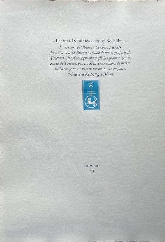 A fine, private press, edition of Dylan Thomas’s well-known Poem in October, translated into Italian, chosen becuse of Franco Riva’s high regard for Thomas’s work. Riva was a librarian and writer on book history in Verona, who in some ten years from 1954 also produced many finely printed volumes on his private press. When his friend Giovanni Mardesteig was asked to contribute to a new edition of “Il Libro Italiano 1800-1965” he declined, but suggested Franco Riva.