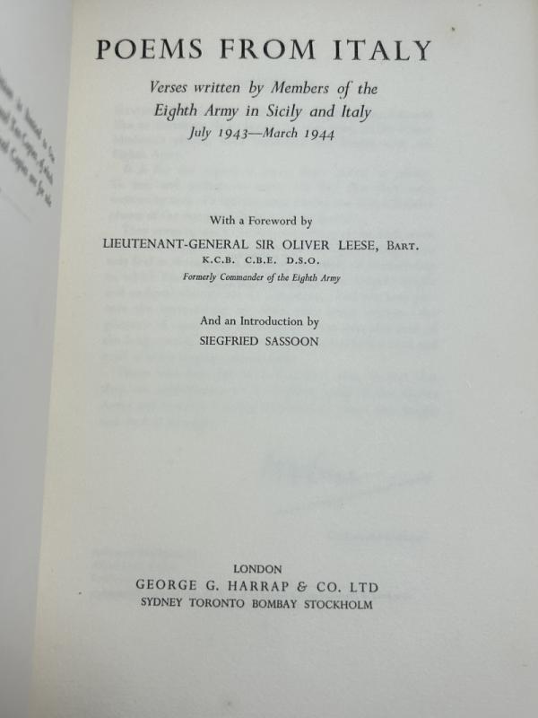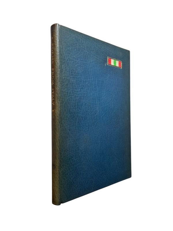 London: George G. Harrap & Co. Ltd., 1945. First and only limited edition. This is a near fine copy. Bound in full dark blue crushed Morocco, mounted to the front panel is a portion of the silk ribbon from the Italy Star medal. Slightly sunned at the spine, though a superior copy, the binding is bright and tight. The text blocks are free from foxing, and the top gilt edge pristine. This is an unnumbered copy, which bears Siegfried Sassoon’s monogram to the colophon. Overall, this is a near fine copy, marred only by the slight toning to the spine. Comprising of 72 poems, written by 47 writers. The poems were submitted in a poetry competition by those who served in the Italian Campaign from 1943-45. Each poem was written in Italy during the first nine months of conflict.