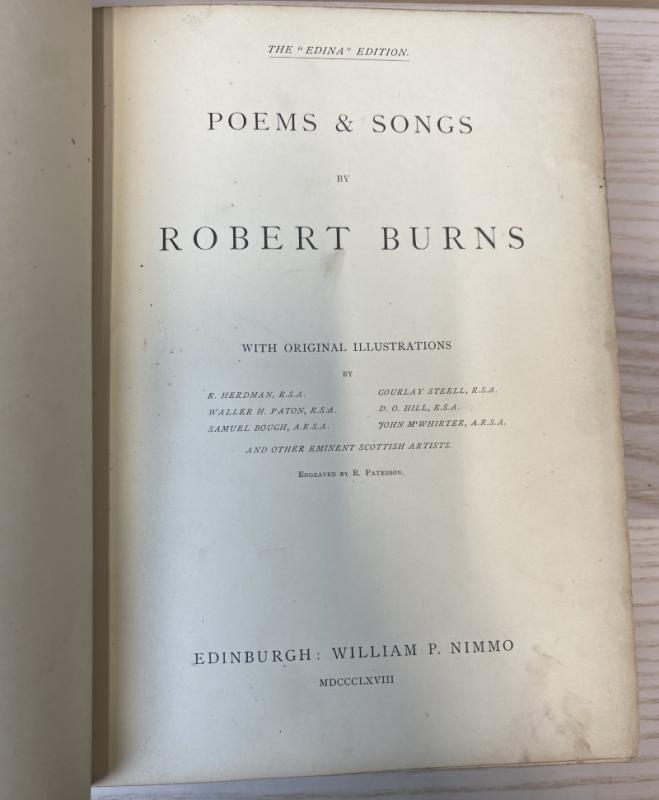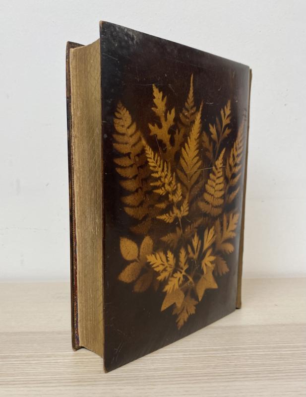 The Edina edition, presented in mauchline fern ware boards. Rebacked with renewed spine, gilt spine label, bands & decorations. All edges gilt & gauffered. Some light wear incl. scratches & minor losses from bumping to the boards. Edges with the odd mark. Some damage to the original marbled front pastedown. Gift inscription to verso of ffep. Occasional spots. A beautiful Victorian bookmark & some pressed flowers loosely inserted through the pages. A beautiful 19th century example collecting Burns' poems in contemporary fernware boards.