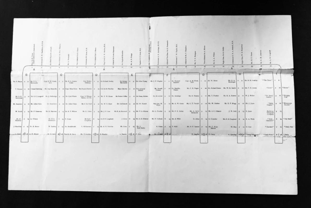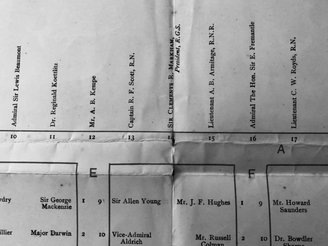 Shows seating plan of officers and crew and various VIPs and press for this large lunch reception on the successful return of the Discovery expedition to London