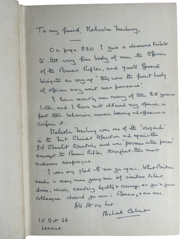 This is a sensational copy, inscribed at length to an instrumental part of the Chindit campaign. Calvert served with Freshney in Burma. Overall, this is a very good (or better) copy.