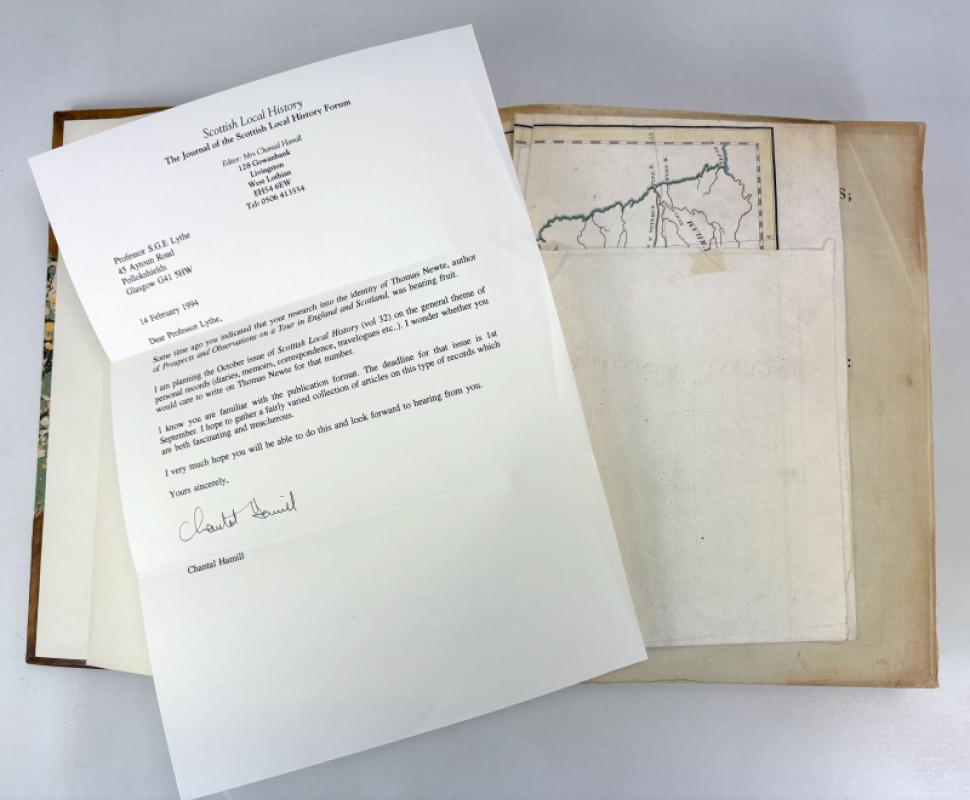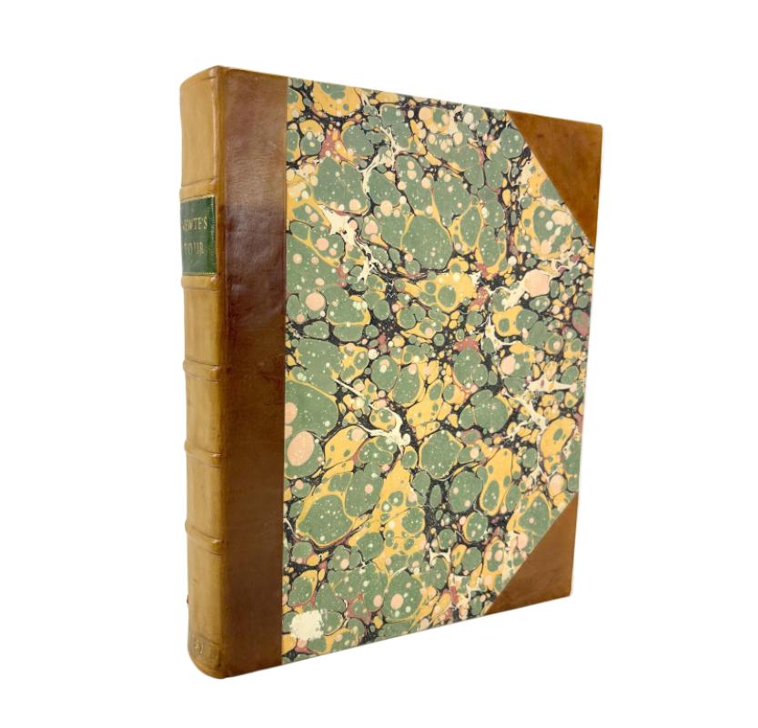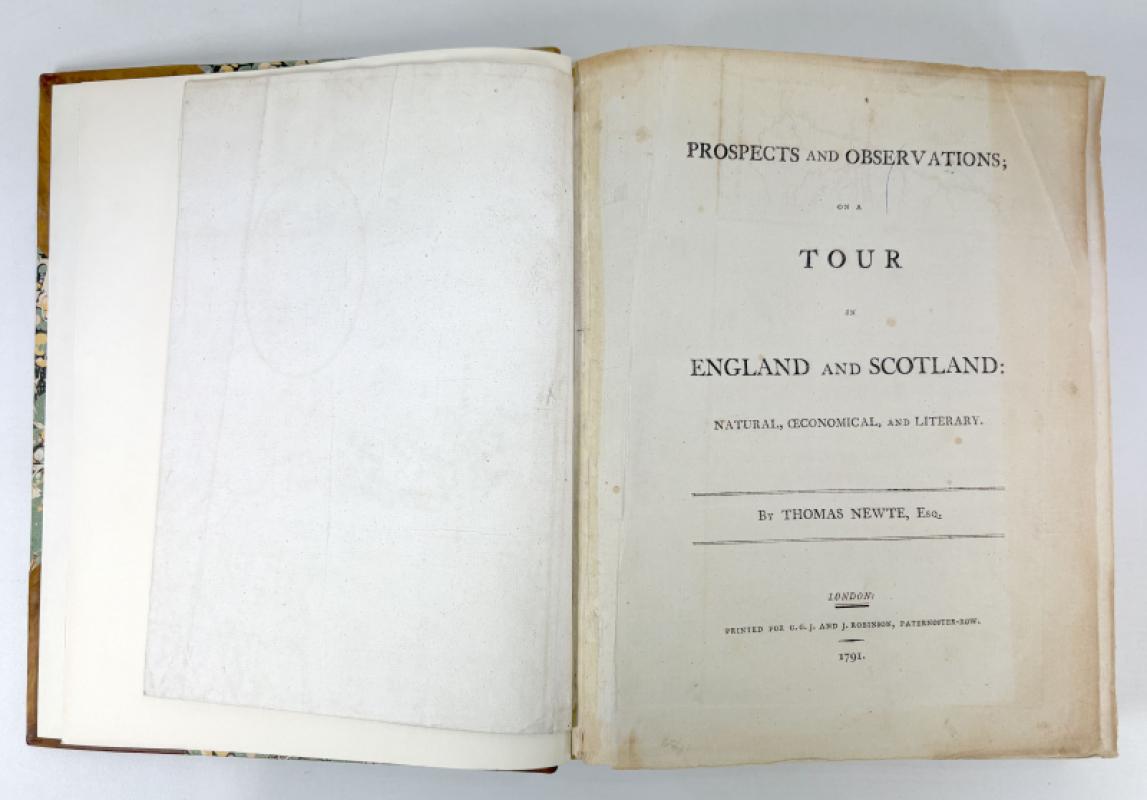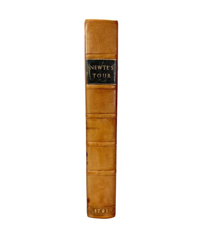 A particularly fine and complete example of Prospects and Observations on a Tour in England and Scotland, first published in 1791, and one of the more engaging late eighteenth century British travel accounts. Written in epistolary form, the work reflects the Enlightenment era interest in domestic travel, landscape, manners and regional character, with Scotland forming a central and sustained focus. Prospects and Observations on a Tour in England and Scotland; Natural, Economical and Literary, by Thomas Newte, Esq. The present work represents the first edition under this expanded title, a shorter version of the tour having appeared a little earlier as A Tour in England and Scotland. The 1791 edition is substantially enlarged and revised, and is regarded as the definitive form of the work. The book was published under the name Thomas Newte, now widely accepted as a pseudonym. The true identity of the author has long been debated. It has been suggested by some commentators that Newte may have been the Scottish writer William Thomson, born in Perthshire and educated at St Andrews and Edinburgh, who is known to have published under pseudonyms. Whilst we're not aware of this attribution having ever been conclusively proven, the author writes under the persona of an English traveller, sometimes described as being from Devonshire, while displaying an intimate and detailed knowledge of Scotland. This tension between assumed English identity and apparent Scottish familiarity has continued to attract scholarly interest. Printed for G.G.J. and J. Robinson, Paternoster-Row, London, 1791. This copy is the first edition of 1791, complete in a single volume, and is exceptional for the survival and quality of its illustrations. All engraved plates are present and uniformly hand coloured, including the folding map, a feature rarely encountered complete. In many copies the plates are uncoloured, partially coloured, or lacking altogether, making this a notably superior example. The volume is handsomely bound in modern three quarters leather, with marbled paper over boards and gilt lettering to the spine. The binding is sound and sympathetic, enhancing the presentation without intruding upon the character of the book. Some tan lines to the leather near the top of the book and spine colour is a little sunned. Unobtrusive 2cm rubbed area to marbled paper near lower edge of front cover. Condition is generally fine/near fine. The text is clean and fresh, the plates are bright and well coloured, and the folding map is intact. There are no significant defects, losses or intrusive markings. The book presents very well and would suit both a serious private collection and an institutional library. Minor flaws include some light creasing and offsetting to the title page, as well as a 3cm blue ink stroke line to same. Some small professional tape repairs to rear of map. All Plates have been remounted into gutter during restoration. Some light offsetting opposite plates as would be expected. A couple of Plates have some foxed spotting opposite. The book is accompanied by a loose letter dated 1994 from Scottish Local History, the journal of the Scottish Local History Forum, addressed to Professor S. G. E. Lythe of Pollokshields, Glasgow. The letter seeks his views on the identity of the pseudonymous author Thomas Newte in connection with a proposed article for the October 1994 issue of the journal. While unpublished, this correspondence provides evidence of continued late twentieth century scholarly interest in the authorship of the work and is retained with the volume. A scarce opportunity to acquire a first edition, fully illustrated and fully hand coloured example of an important late eighteenth century tour of England and Scotland, offered in excellent condition and with added research interest. This copy represents the only fully hand-coloured example of this work we have come across. Text in English. VIII + 440pp + 1 large folding map + 23 Plates (all hand-coloured). Dimensions: approximately 277mm high x 225mm wide x 43mm deep. Weight: Approximately 1530g (unpacked).