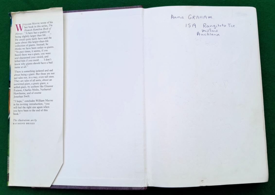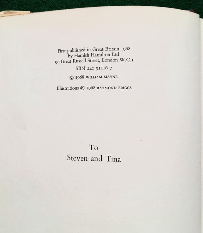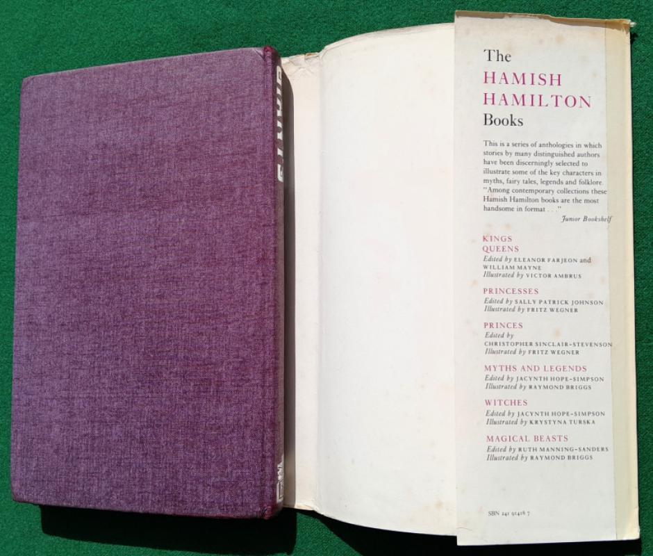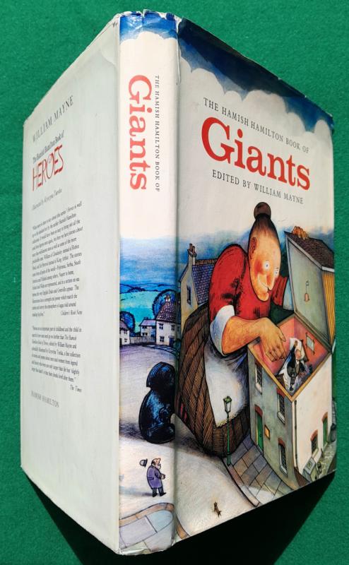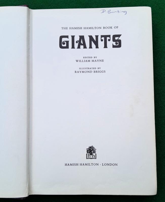 Raymond Briggs [artist] The Hamish Hamilton Book of Giants. Edited by William Mayne. Various authors including Amabel Williams-Ellis, Oscar Wilde and Jonathan Swift. Line illustrations throughout by Raymond Briggs, including several full page. 216 pages, Ownership details and some indentations on front free fly and name at head of title page, pale blue ticks to one margin, a few marks else contents generally very good and sound. 255 x 175 mm [approx. 10” x 7”] purple cloth titled in silver on spine, very good in price clipped and slightly edge worn coloured pictorial dust jacket. London. Hamish Hamilton 1st edition 1968. Early work by Briggs.