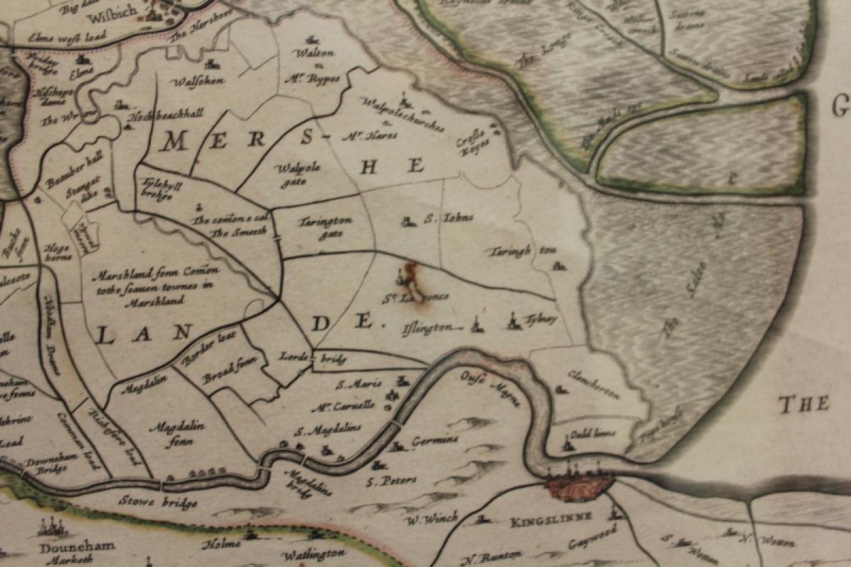 A very attractive, finely engraved and historically interesting 17th century map of Fens which was published by Joan Blaeu for his Atlas Maior (Amsterdam: 1664) and has the expected centre crease. The map is probably based on a now lost manuscript map by William Hayward and shows the Fens before they were drained by Cornelius Vermuyden in the 1650s. The map is orientated so North is pointing to the right. There is one very small hole, as seen. The map is mounted, framed and glazed. measures 56 x 44 cm approximately. 75 x 65cm framed.
