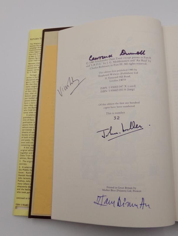 Return to Oasis: War Poems and Recollections from the Middle East, 1940-1946. One of 100 numbered copies, this being copy number 32, signed by Lawrence Durrell, Victor Selwyn, John Waller and Tambimuttu.