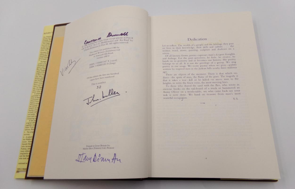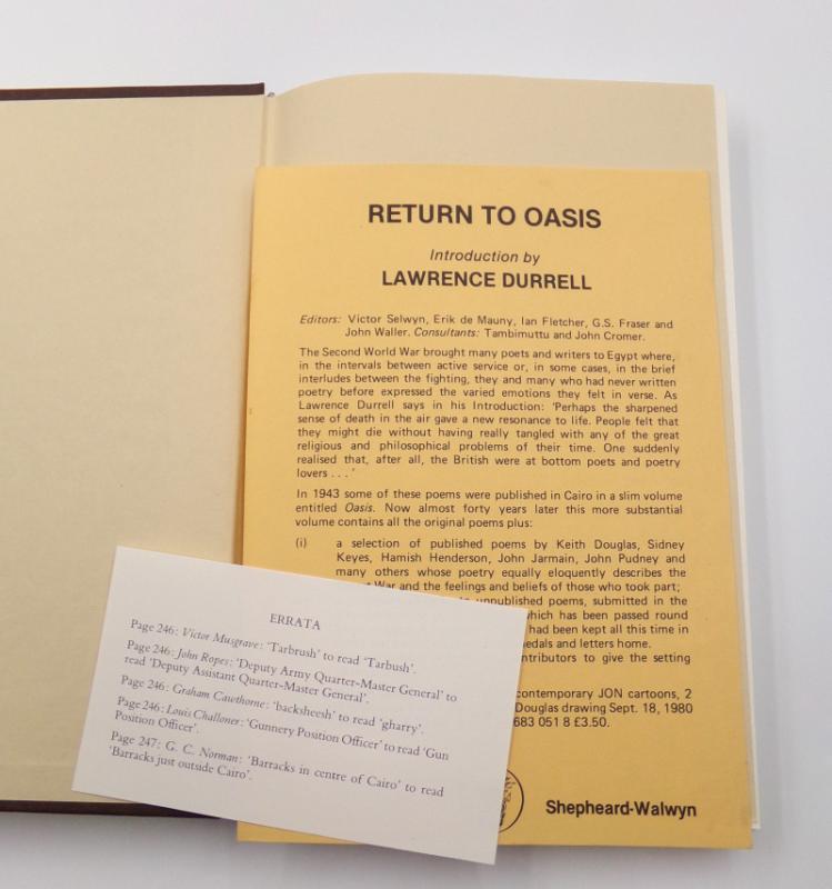 DURRELL, Lawrence (contributor) Return to Oasis: War Poems and Recollections from the Middle East, 1940-1946. London: Shepheard-Walwyn in association with Editions Poetry London 1980. Introduction by Lawrence Durrell. One of 100 numbered copies, this being copy number 32, signed by Lawrence Durrell, Victor Selwyn, John Waller (editors) and Tambimuttu (consultant).With errata slip, laid in. Publisher’s information sheet, also present. Fine in dj.