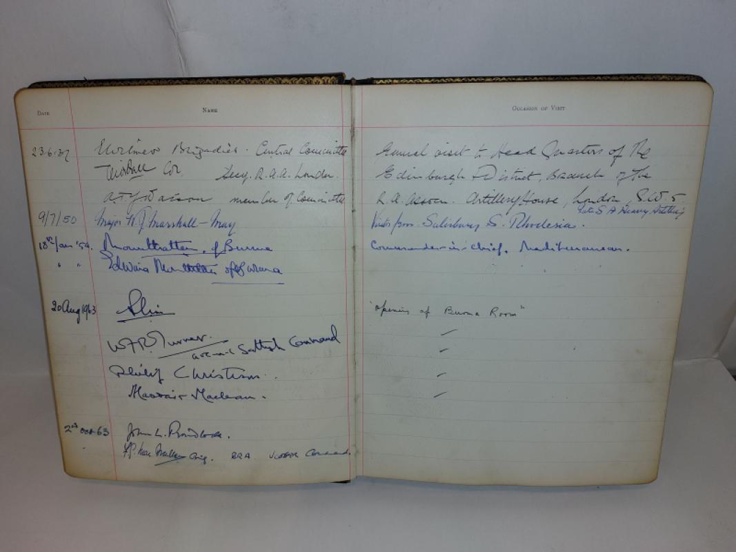 The 'Distinguished Visitors' Book' for the Royal Artillery Club, Edinburgh 1924-1964 containing 43 signatures with brief details of their visit including Earl and Lady Mountbatten of Burma, Sir William Slim F. M. (sometime Governor General of Australia) connected to the opening of the 'Burma Room', Alastair Maclean and other military officials, mainly Scottish, crest and title to front board gilt, marbled edges, retailer's label to front paste-down, former catalogue entry clear taped to blank leaf, manuscript