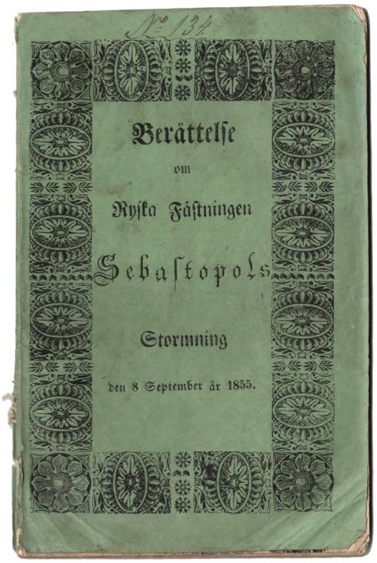A contemporary account of the storming of Sebastopol during the Crimean war, taken from reports by The Times’s correspondent. The printed wrapper bears the longer title ‘Berättelse om Ryski Fästningen Sebastopols Stormning den 8 September år 1855’ (Story of the storming of the Russian fortress Sebastopol on September 8, 1855).