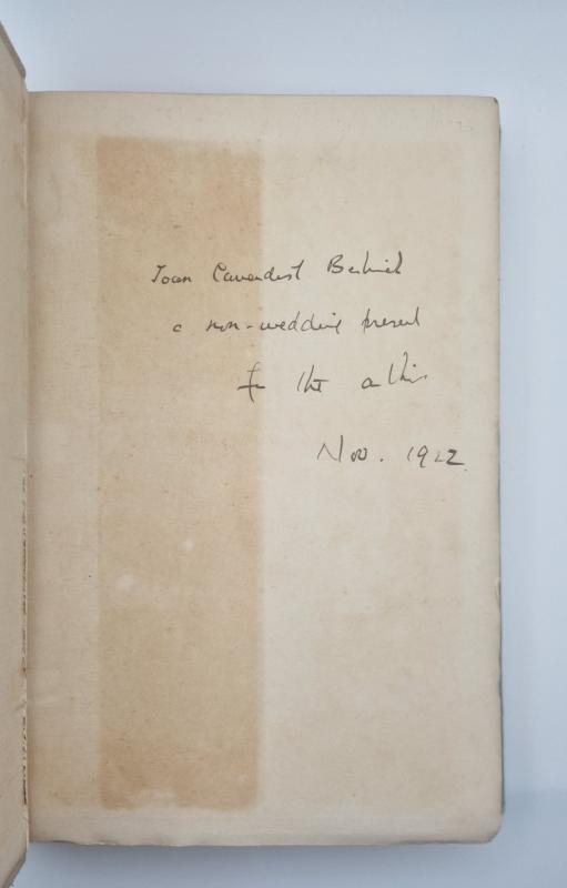 1st Edition. Inscription in ink to the ffep signed 'from the author' dated Nov1922 on the occasion of the wedding of Joan Cavendish Bentinck. The author describes herself as a 'non-wedding friend'.