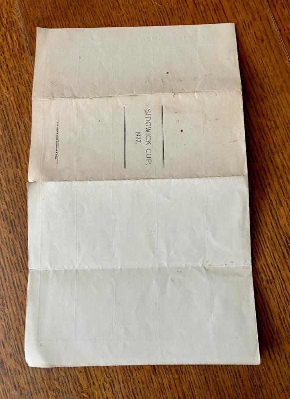 4pp score chart showing the names of he players in the 1st heat, played on April 15th, 1927, plus those players with a bye to the second heat, played on the same day. The spaces to write in the competitors that moved through the heat stages have not been filled in. The whole opened sheet measures 16.6 x 13.2 inches and folds down to a slim 3.3 x 8.3 inches to allow for fitting into a pocket. Creases on the folds, as expected, but overall in very good condition.