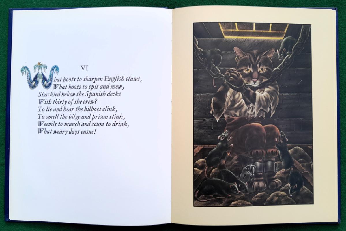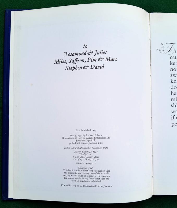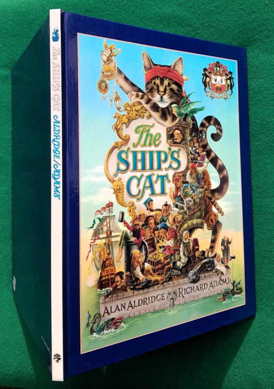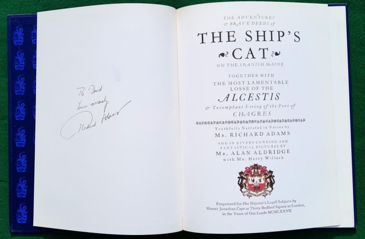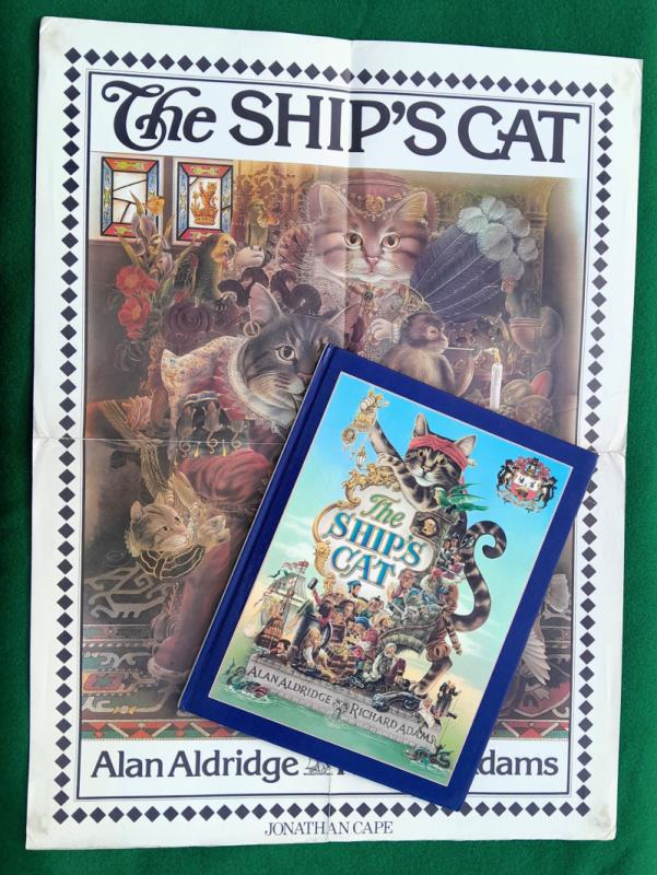 Richard Adams SIGNED COPY. The Adventures and Brave Deeds of the Ship's Cat on the Spanish Maine Together with the Most Lamentable Losse of the Alcestis and Triumphant Firing of the Port of Chagres. Decorated endpapers, beautifully detailed colour illustrations throughout by Alan Aldridge with the story told in verse [32 pages]. 285 x 225 mm [approx. 11 ¼” x 9”] glossy pictorial boards. Signed and inscribed by Richard Adams opposite the title page. Near fine condition. Jonathan Cape 1st edition 1977. WITH the original publisher’s poster; 580 x 430 mm [approx. 23” x 17”] folded and with some edge creasing, blue-tack marks on rear but still very good.