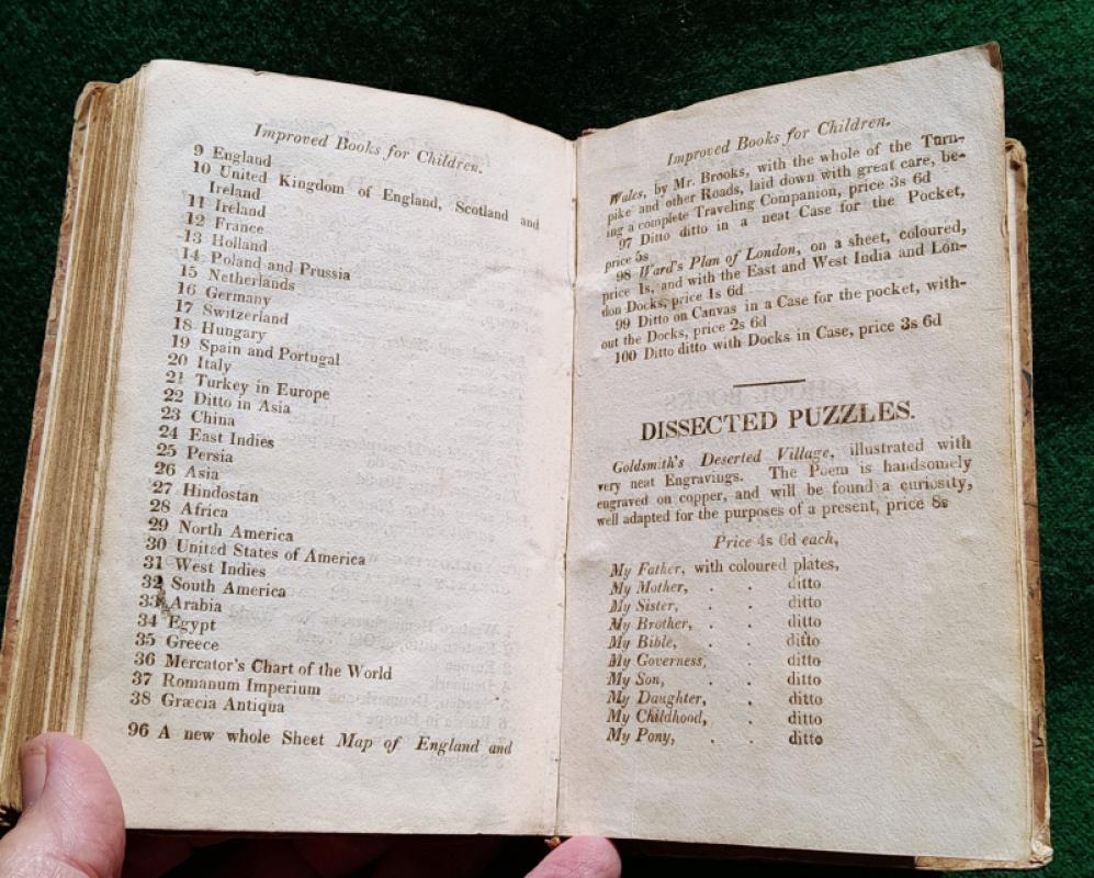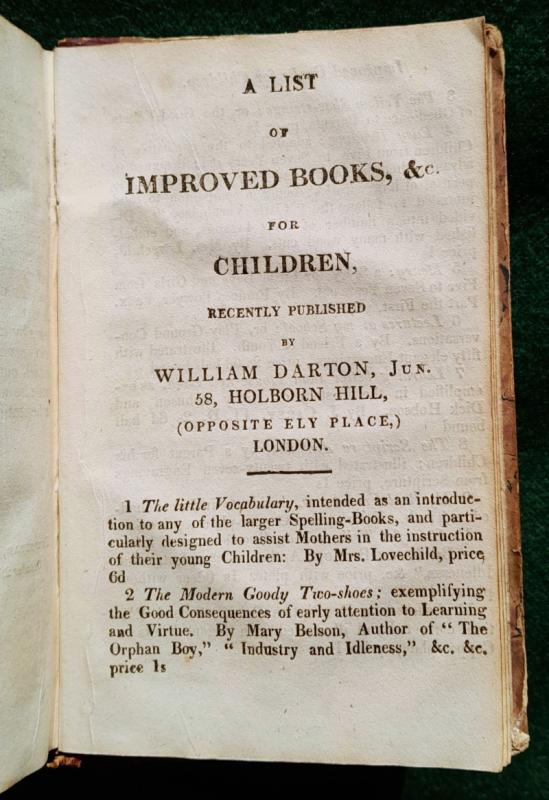 Engraved frontispiece of a baby donkey with its mother, and underneath is a verse [by Coleridge] “Poor little foal of an oppressed race……” 231 pages, plus a fascinating 16 page list of publisher’s recently issued Improved Books For Children, Dissected Puzzles, Maps and Games etc. There is a gift inscription on the title page, and a later owner’s pictorial bookplate on the front pastedown, some rippling of leaves, occasional marks and points of wear else contents very good. 142 x 95 mm [approx 5 ½” x 3 ¾”] original gilt lettered red roan spine, marbled paper over boards; spine ends and corners worn, some rubbing but generally a very good copy. London, Printed By and For William Darton Jun, 58 Holborn Hill, 1815