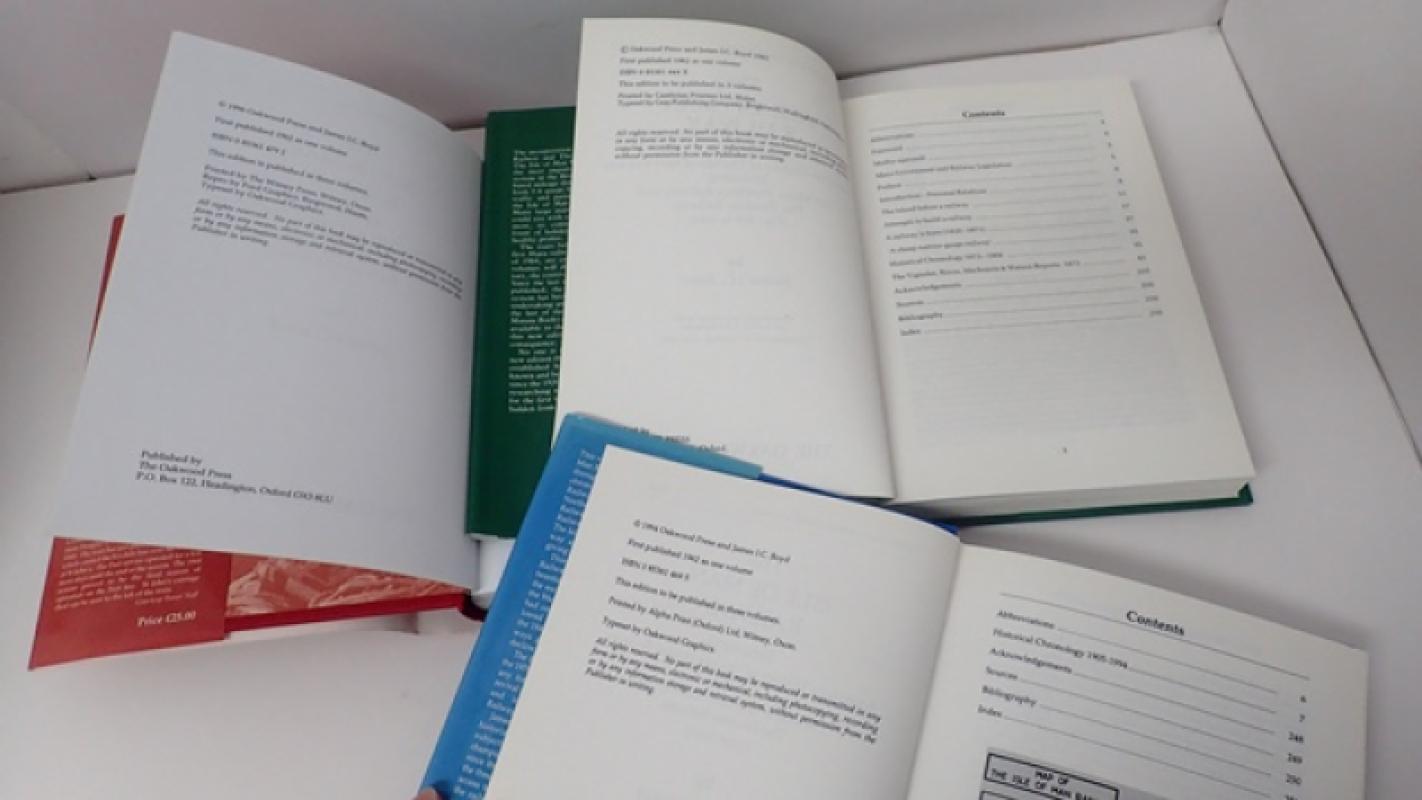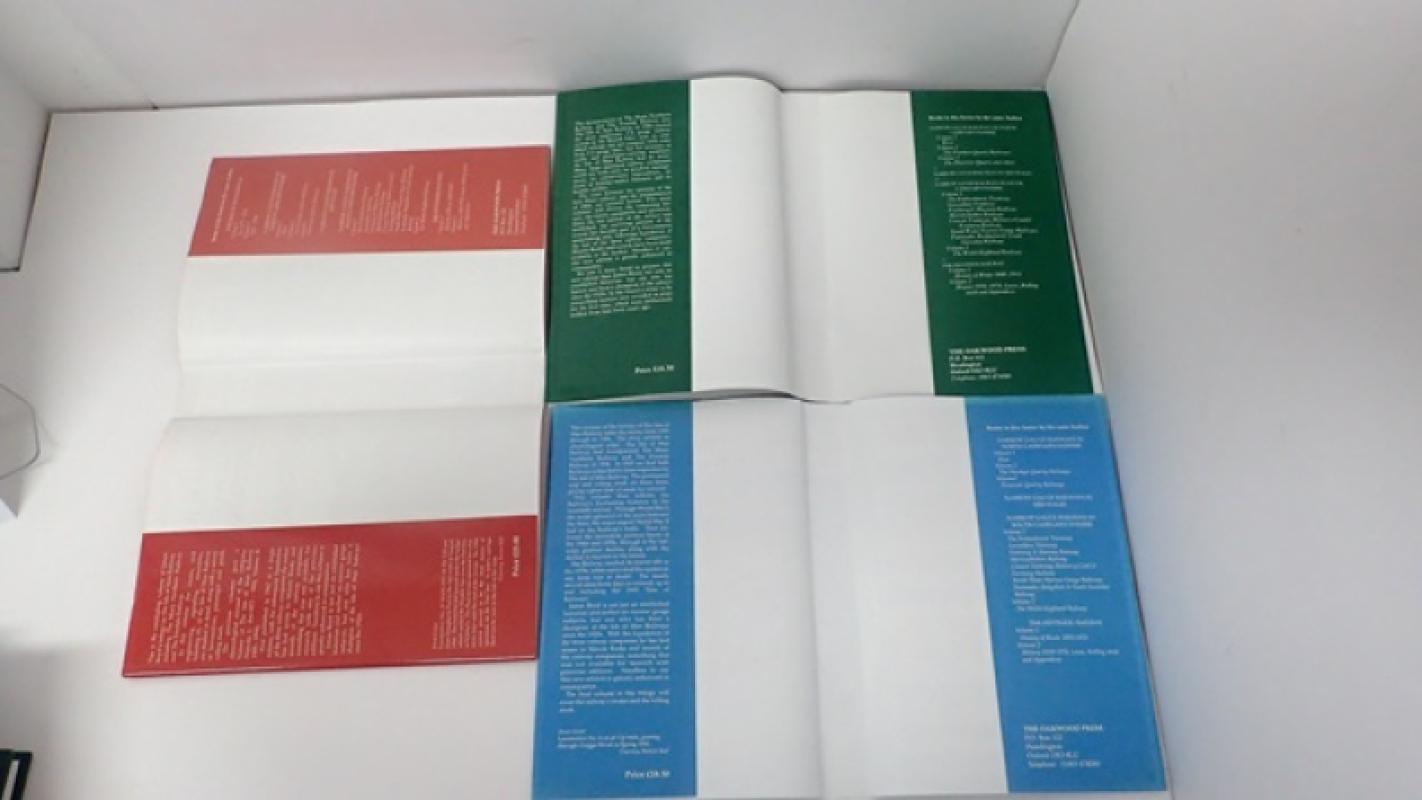 Volume One: An Outline History of the Isle of Man Railway Including the Manx Northern Railway and the Foxdale Railway Pre 1873-1904 (1993), 085361444X. Volume Two: An Outline History of the Isle of Man Railway including the Manx Northern Railway and the Foxdale Railway 1905-1994 (1994) 0853614695 , Volume Three: An Outline History of the Isle of Man Railway including the Manx Northern Railway and the Foxdale Railway (1996) 0853614792. All three volumes are in very good condition externally, and tight, bright and clean internally. The three dust jackets are intact, with just a little mild creasing to the edges, however, the spine areas are very slightly faded. Additional photos are available upon request. When securely packed this item will weigh in the region of 2423g. (YBP Ref: 035389:15h)