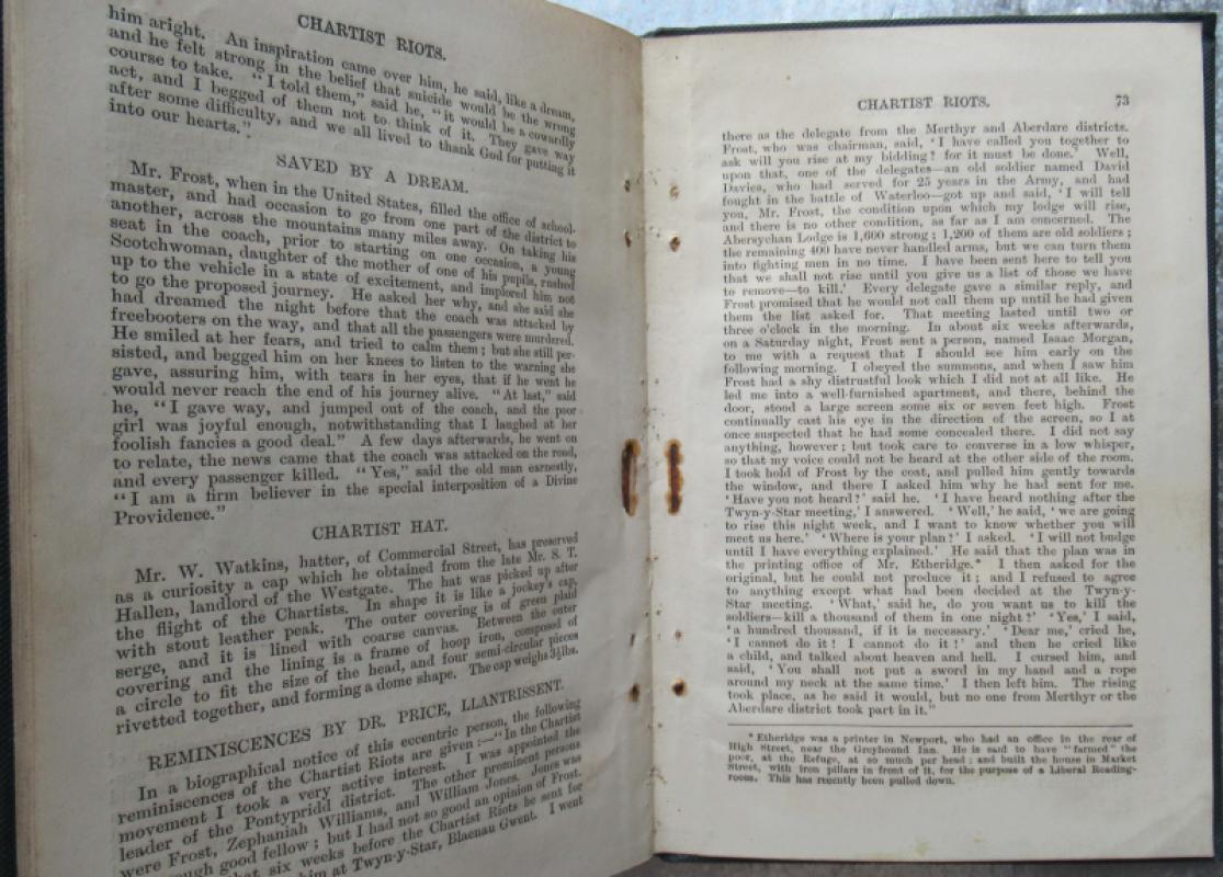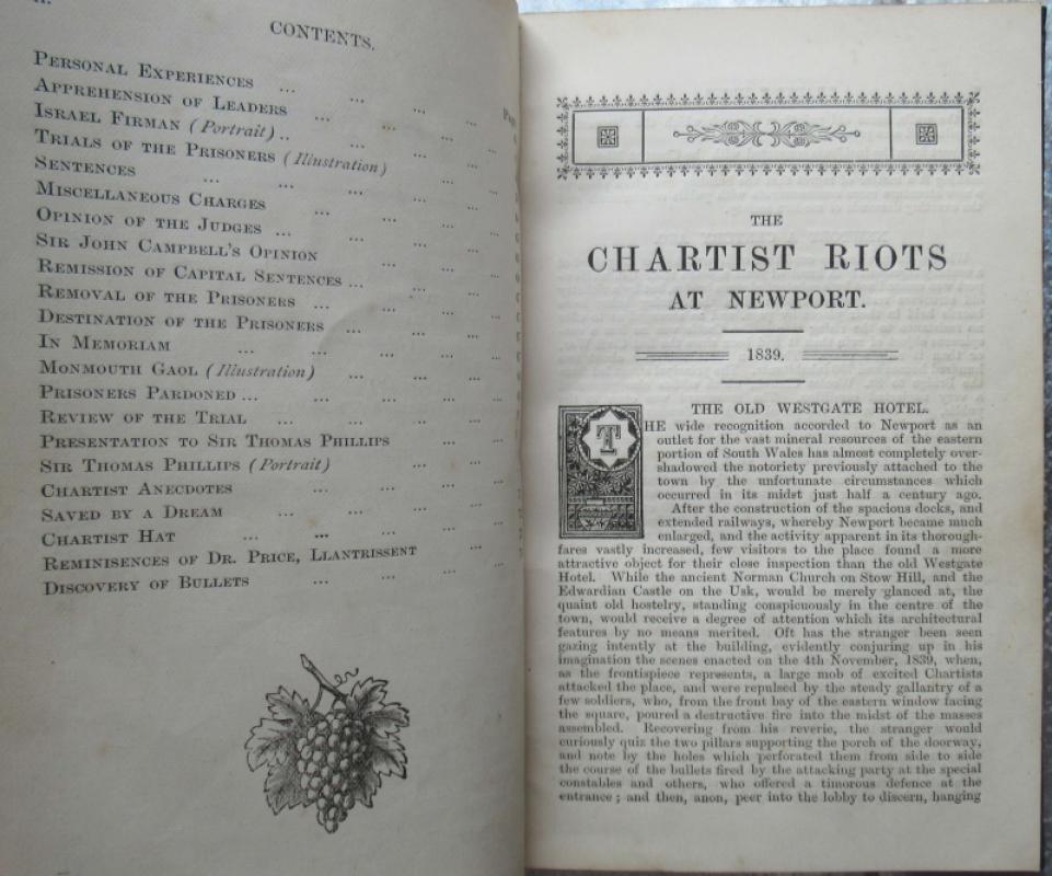 Second edition. 74 pages + 3 illustrated plates, with seemingly the frontispiece and another full-page illustration included within the pagination. Staple-bound. The book is quite firmly bound in lightly marked, bumped and rubbed plain dark green cloth, looking to date from the early twentieth century. The text block is slightly foxed, marked and age toned, with some dog-eared page corners and rusting around the staples. To both the front and rear pastedowns is the pencil ownership inscription of a Thomas F. Bindon. A detailed account of the 1839 battle which occurred in Newport, centred around the Westgate Hotel, between thousands of the Chartists and their sympathisers and a much smaller group of heavily armed soldiers. Including background on Newport, the history of Chartism in Wales, short illustrated biographies of the principal Chartist leaders, the circumstances leading to the battle, its aftermath and considerable detail of the subsequent trials of those arrested. It was originally published in one of Johns’s newspapers, followed by a first appearance in book form in 1884, and finally this second edition. Though quite well represented in institutional holdings it is rare in commerce.