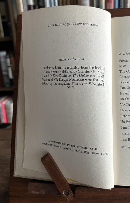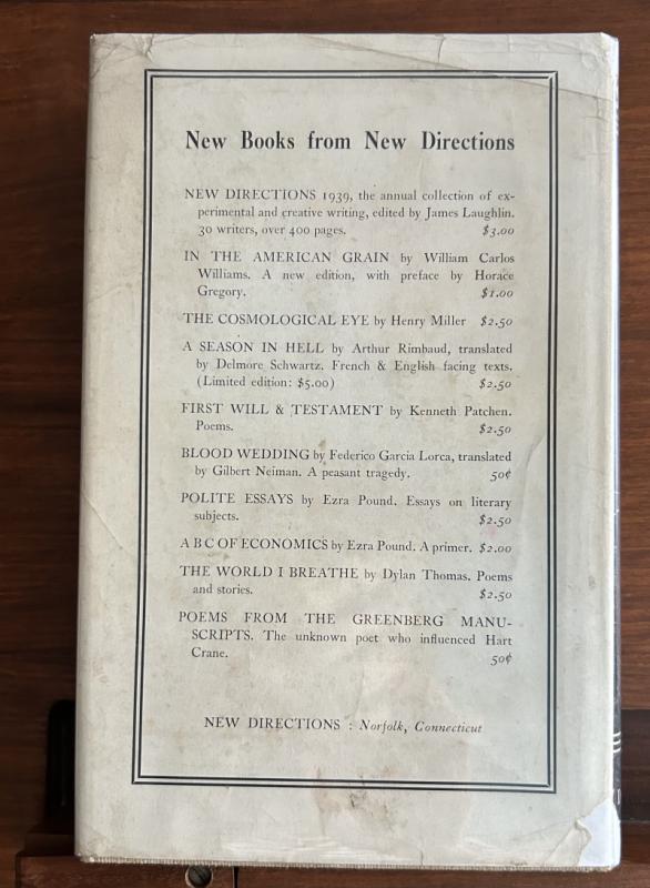 Henry Miller's first publication in America. This collection, first published by New Directions in 1939, contains a number of Henry Miller’s most important shorter prose works written the period of Miller’s and Lawrence Durrell’s life in Paris. Short stories (notably Max and The Tailor Shop) are mixed with philosophical essays, the prose poems and surrealist fantasies, the travel sketches and scenarios, all displaying Miller’s passion for telling the endless stories the life of the mind and the body; of people, places and things; of ideas and the imagination.
