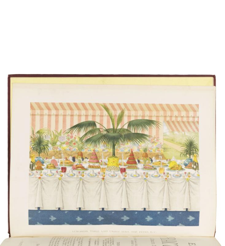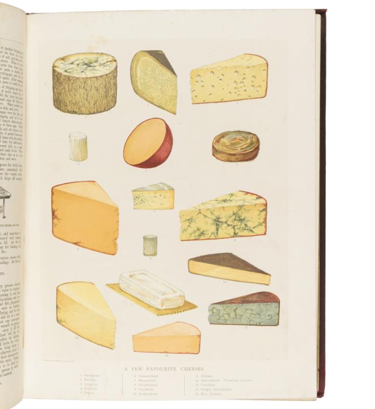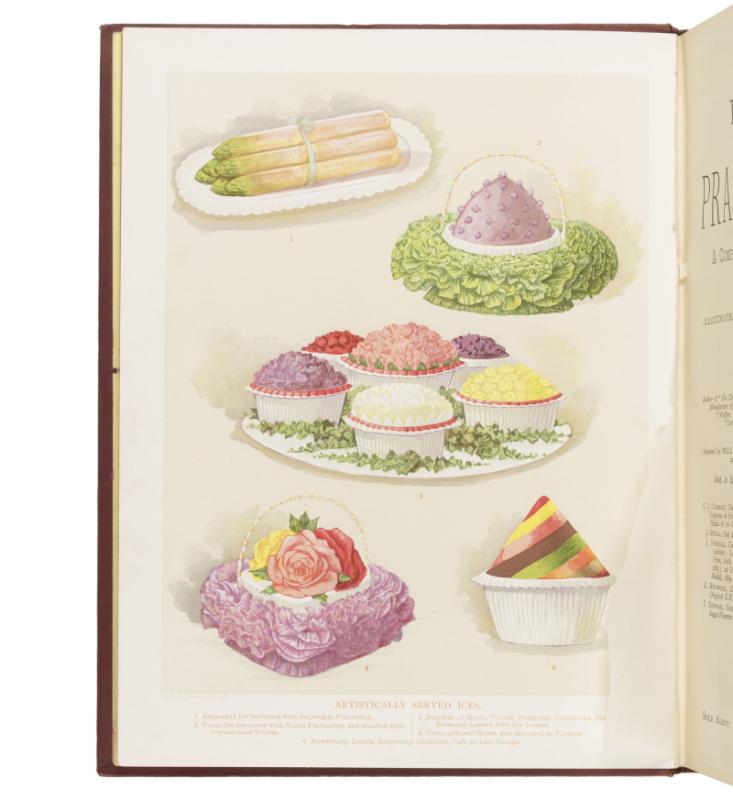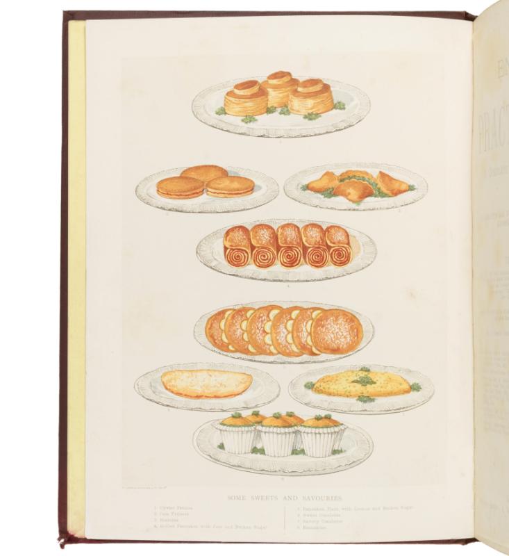 Price 8/6 per each division. Scarce in the original binding. A wonderful production with period colour plates and hundreds of black & white illustrations. The Cyclopædia runs from Abat-Faim, a hunger-reducer, to Zweibachen, ‘the name of some famous German cakes’. Together with ‘Menus of Dinners, Suppers, and Luncheons, given on various important or historical occasions’, and a monumental index covering all 9 divisions. Division VII includes a folding double-page plate printed in silver illustrating ‘Artistic Serviettes’, numbers 1 and 2.