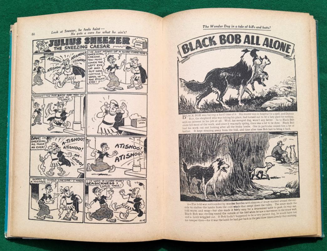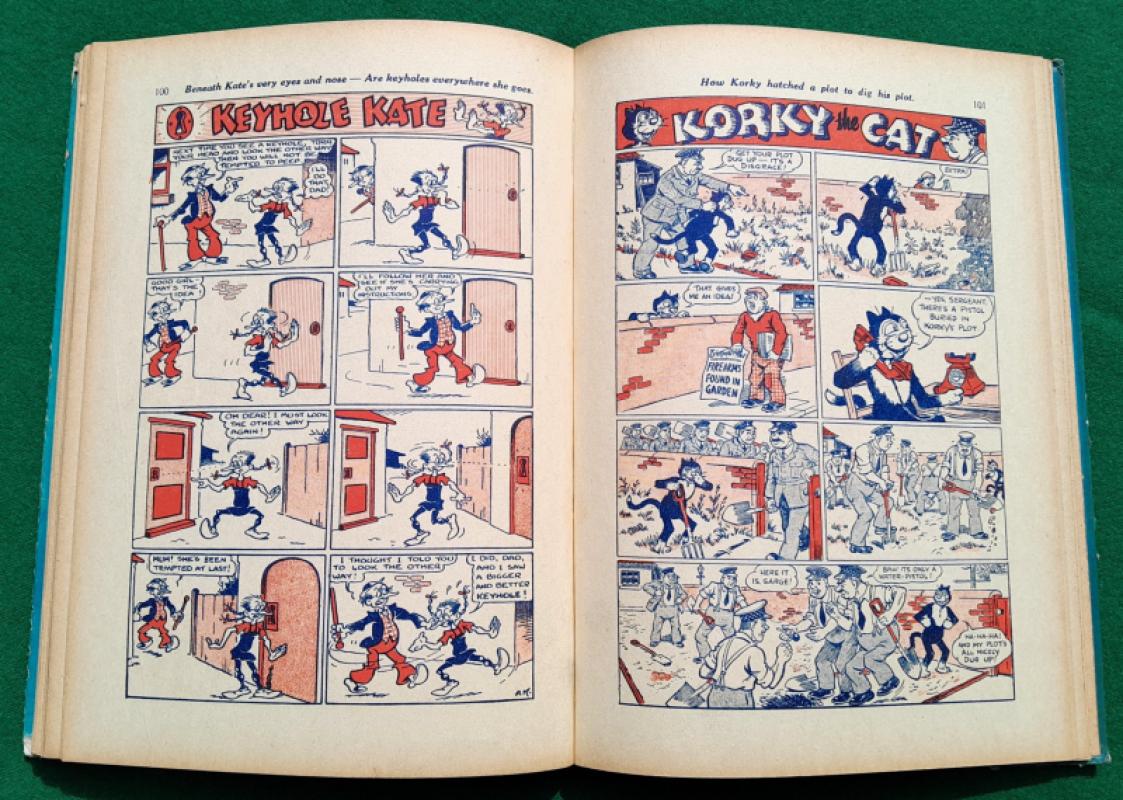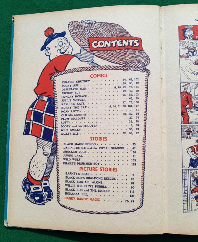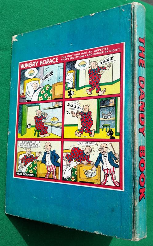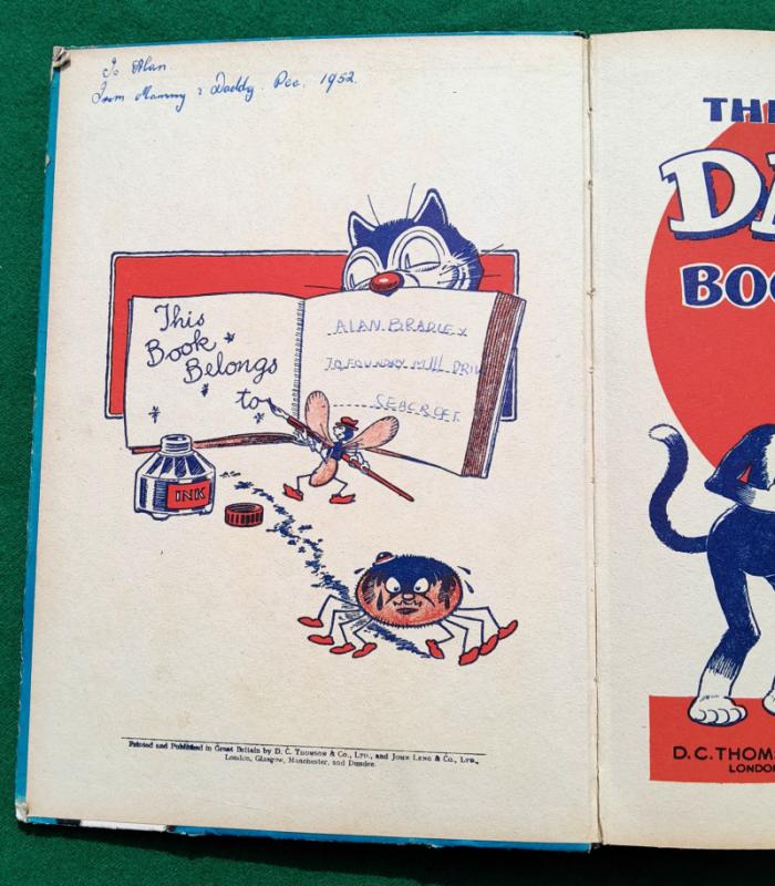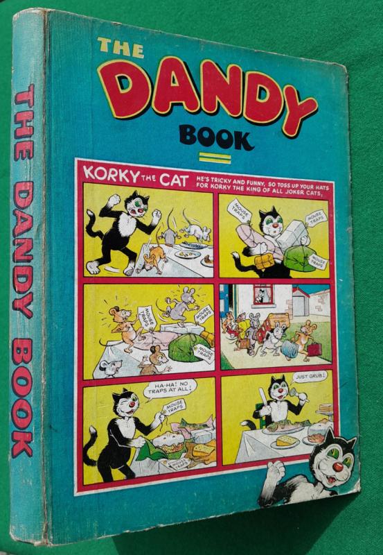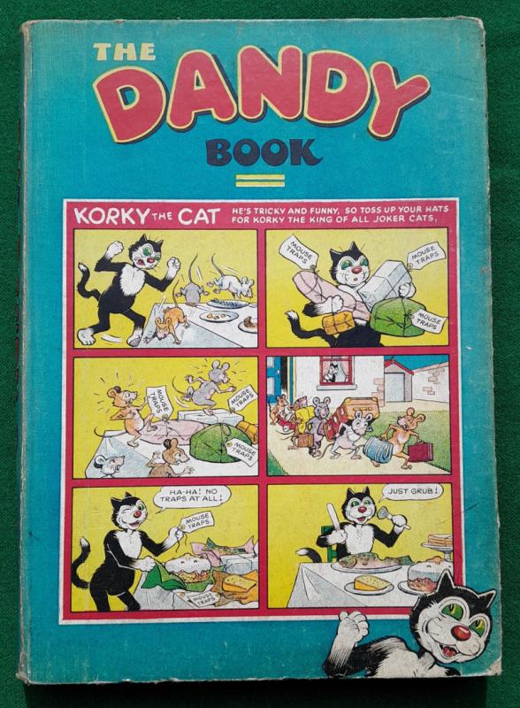 The Dandy Book [1953] Cover picture shows Korky the Cat fooling mice by disguising food as mouse traps. Picture strips and illustrated stories throughout. Characters include Desperate Dan, Freddy Fly, Keyhole Kate, Julius Sneezer and Noah Lott. 127 pages. Inscription on the front pastedown, pages tanned [as usual] else contents clean and sound. 285 x 210 mm [approx. 11” x 8”] pictorial boards; some grazing and wear at extremities, still a bright and generally very good copy. D C Thomson & Co. Ltd., and John Leng & Co., Ltd