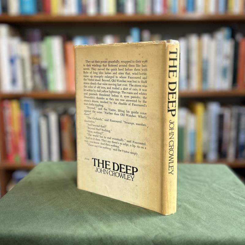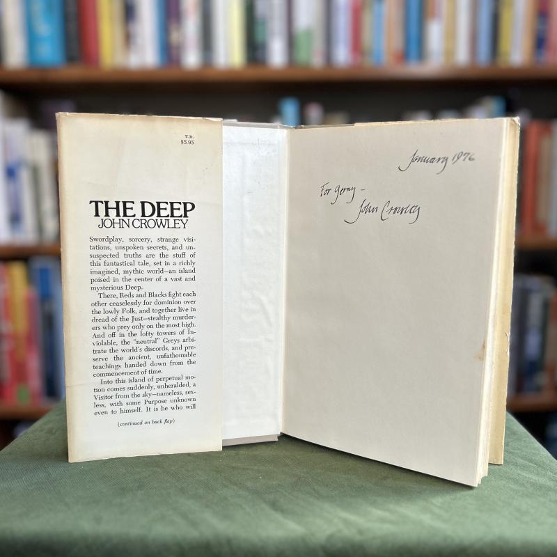 The Deep is the debut novel from American speculative fiction writer John Crowley, best known for his 1981 fantasy novel Little, Big. The first of Crowley’s three sci-fi works from the 70s, The Deep follows a not-quite-human visitor to a medieval world torn apart by a struggle based on the English Wars of the Roses. This true first edition with jacket art by John Cayea is in very good condition and is notably scarcer than first editions of Crowley’s later work. This copy is inscribed by Crowley in calligraphy and dated 1976.