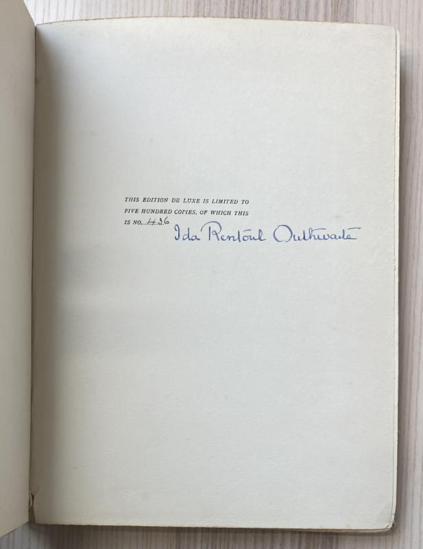 De Luxe limited edition, one of 500, this No. 436. Signed by Ida Rentoul Outhwaite to the limitations page. Publisher's cream decorative cloth, gilt titles to spine and front board, extremities a little bumped in, spine ends similarly, with some losses to the head of the spine. Occasional marks to the cream boards, front board generally smart, rear board with a few scratches, damp stains and a green paint mark to the rear joint. Binding tender throughout, with occasional strains exposing binding. A few spots but leaves generally bright. Collated and complete with sixteen tipped-in plates in colour and fifteen monochrome plates; colour plate facing p61a little edgeworn with two closed tears of approx 1" to the margins. A lovely signed limited edition by Australian illustrator Ida Rentoul Outhwaite.