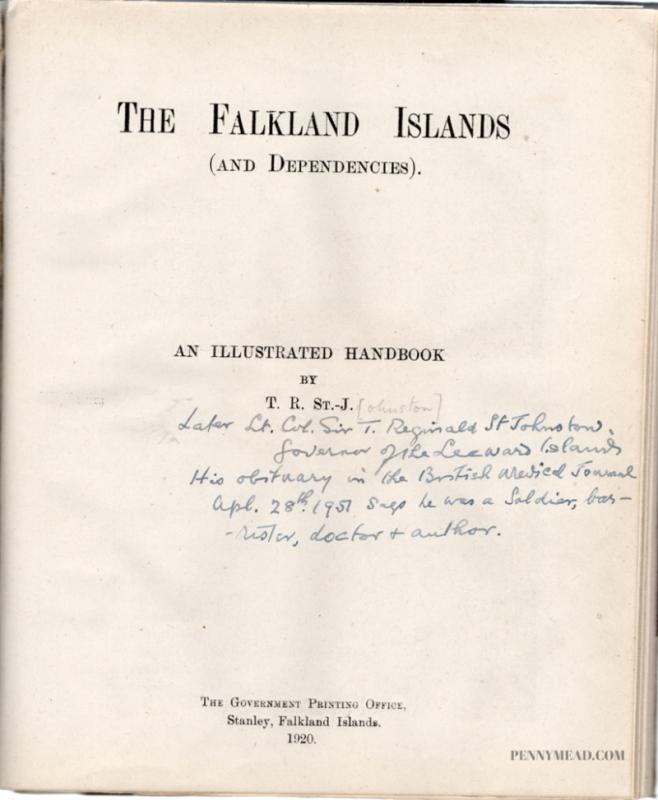 ST JOHNSTON T.R. The Falkland Islands (and Dependencies) An illustrated handbook Government, printing office, Stanley, Falkland Islands (1920) 100pp + plus plates and map. 1st ed., a few neat contemporary m/s endorsements. Clean in old, possibly original cloth. Rare.