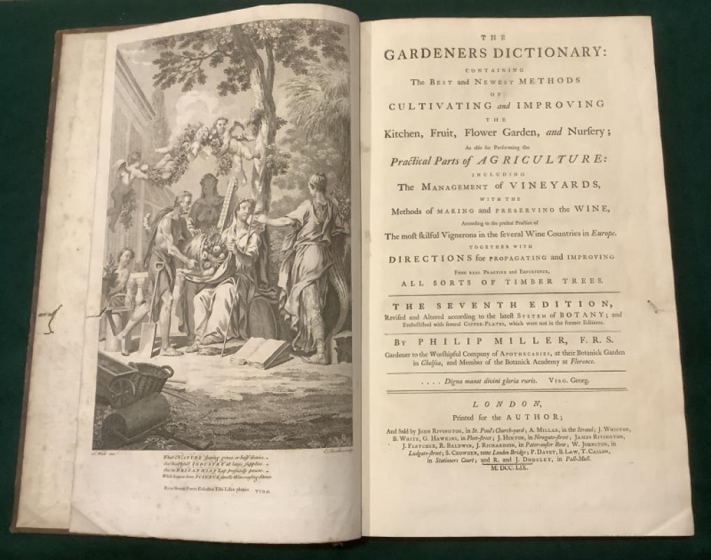 MILLER, Philip. The Gardeners Dictionary: containing the best and newest methods of cultivating and improving the kitchen, fruit, flower garden, and nursery... The seventh edition, revised and altered according to the latest system of botany. Two volumes. [1368]pp., engraved frontispiece and 19 engraved plates. Full contemporary calf, ornate gilt panelled spines, with red and green morocco labels. Minor wear to the head and tail of the spines, but a handsome copy. Internally there is some worming, mainly marginal and confined to the first section of Vol I. Discolouration to the end-papers and paste-downs.