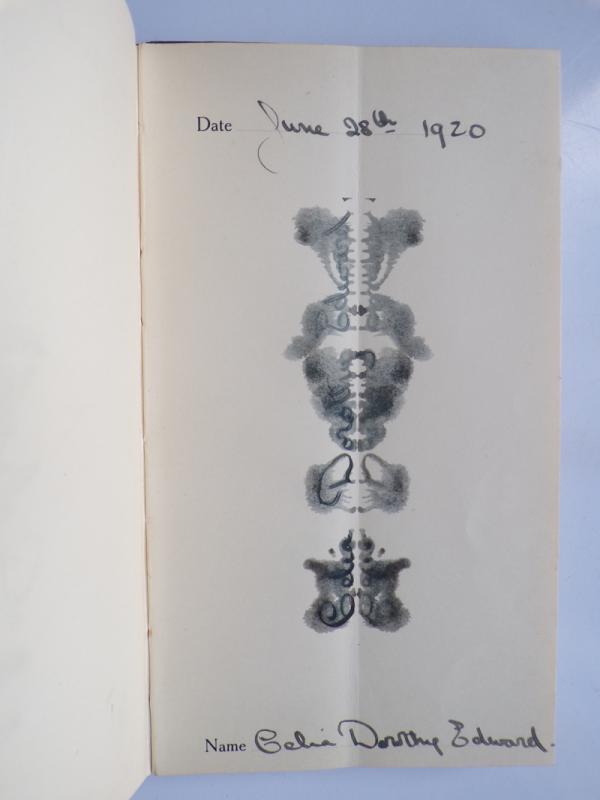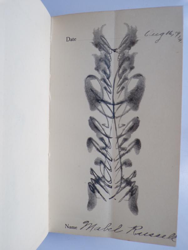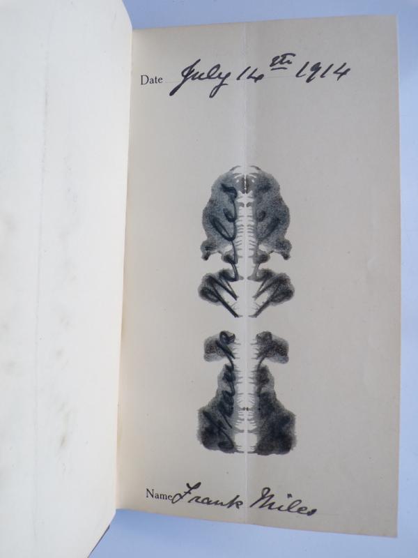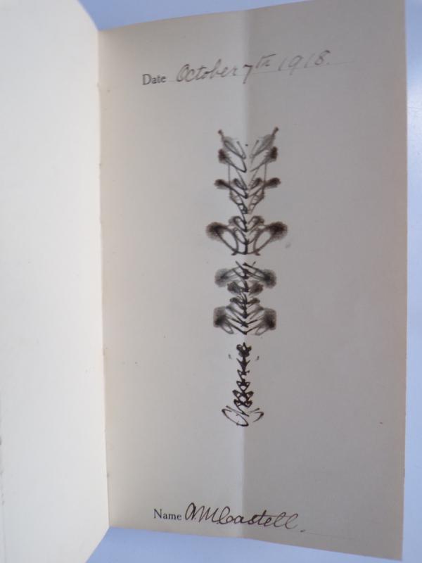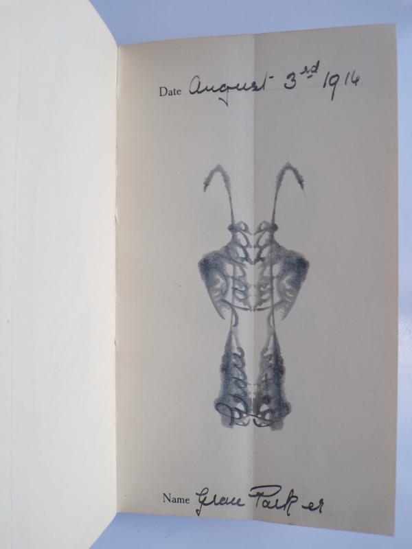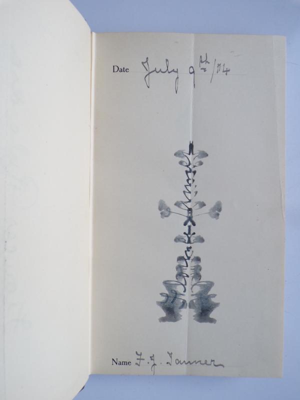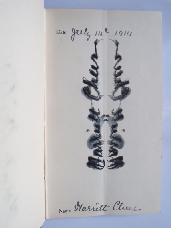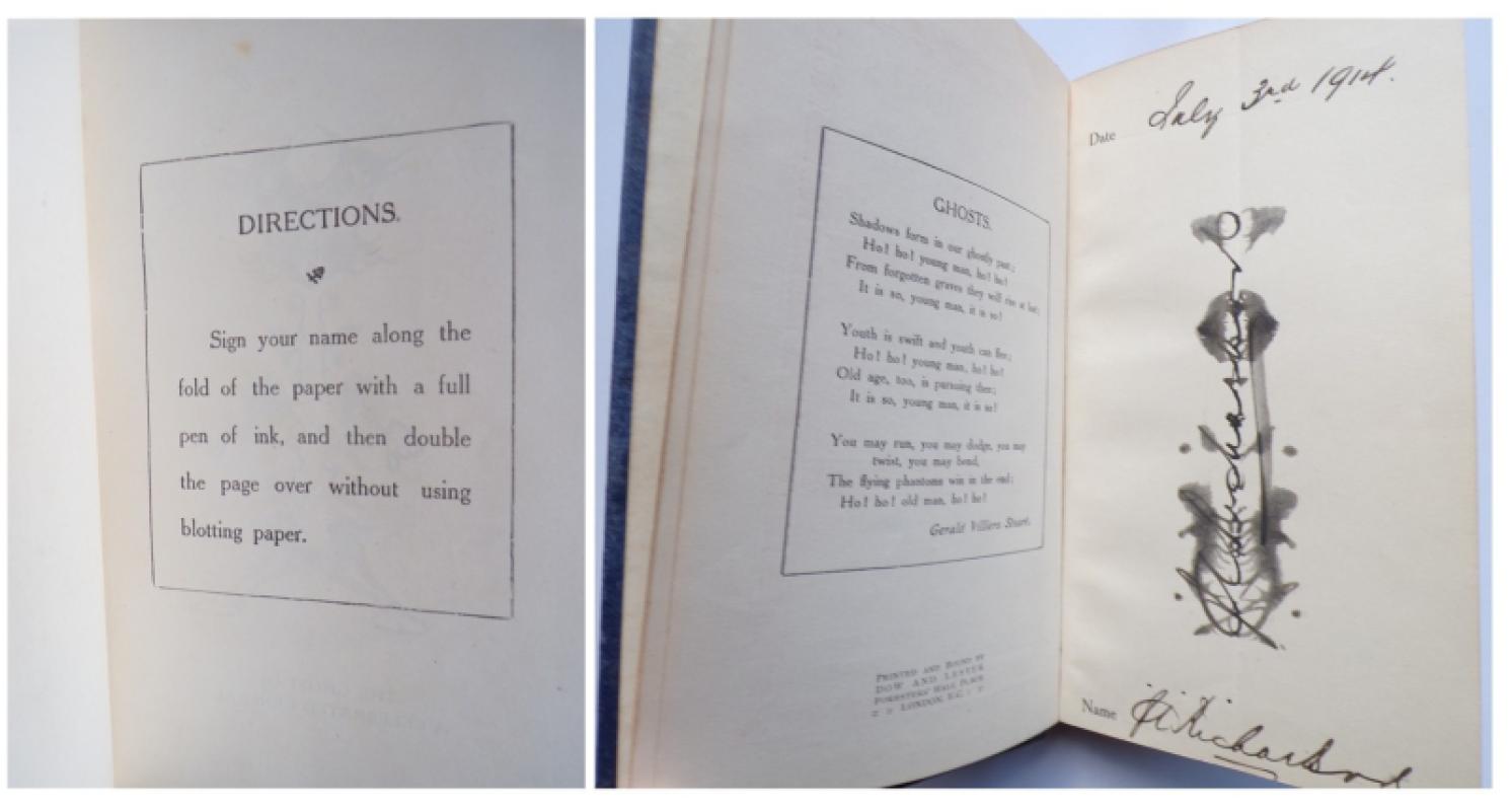The Ghosts of My Friends, was a popular Edwardian-era novelty autograph book and Parlor game where participants create inkblot "ghosts" from their signatures. The book was designed as a playful twist on the popular autograph albums of the early 1900s, blending the hobby of autograph collecting with the contemporary fascination with spiritualism. Participants use a fountain pen and sign their name in wet ink along a vertical crease or fold in the page. The page is then folded back upon itself, blotting the signature to create a symmetrical, Rorschach-like inkblot image, which resembles a "ghost" or some other figure, such as an insect or a frog. The book consists primarily of blank pages made from a paper suitable for blotting, which a number might be filled with unique signatures and their resulting "ghosts"