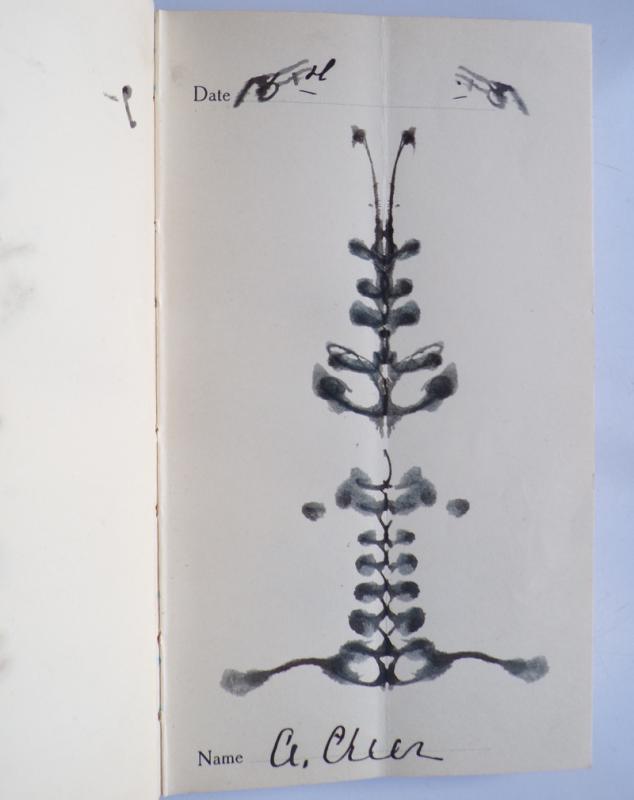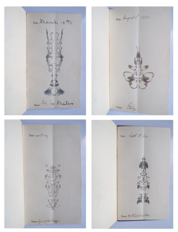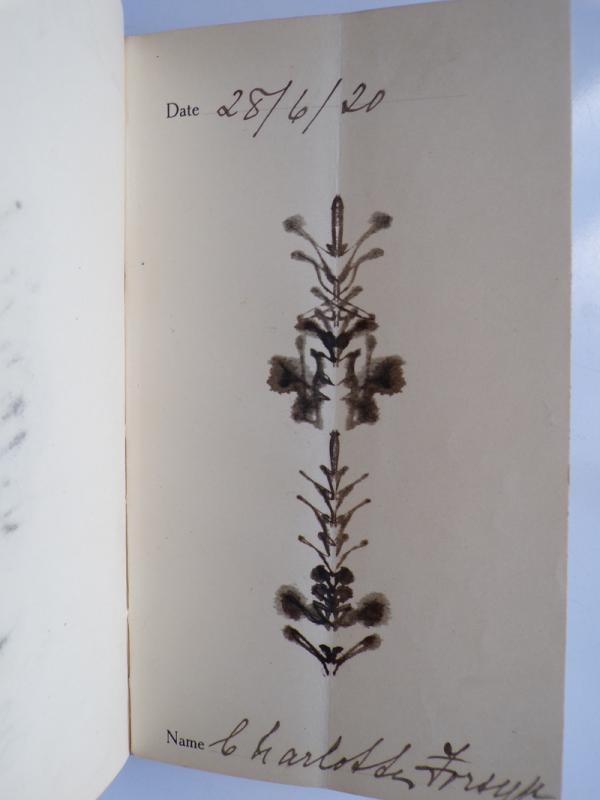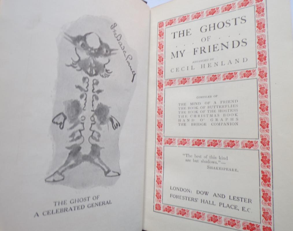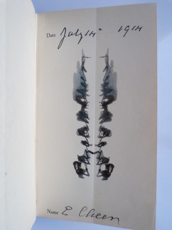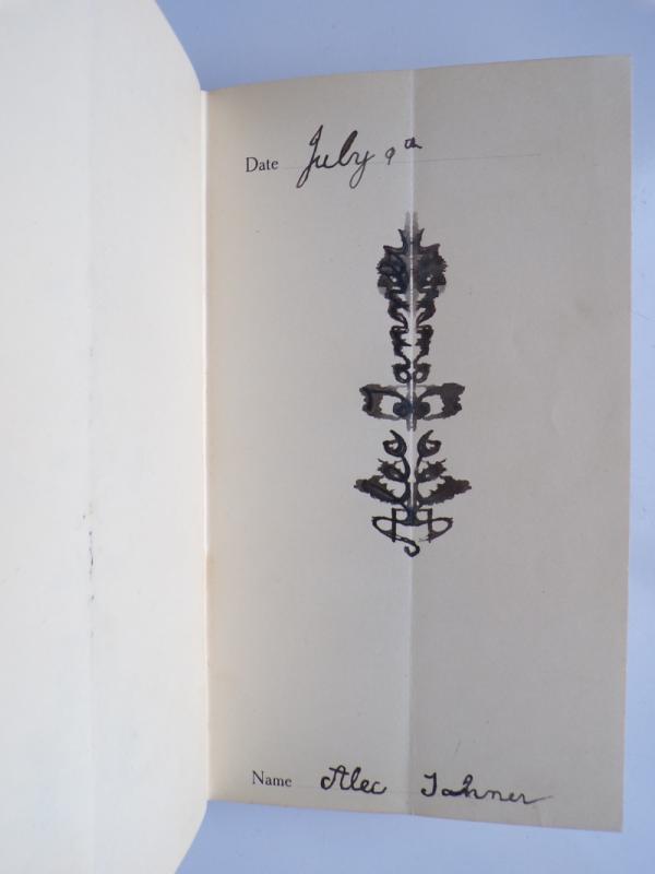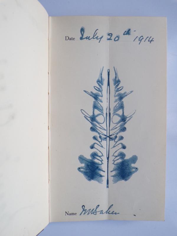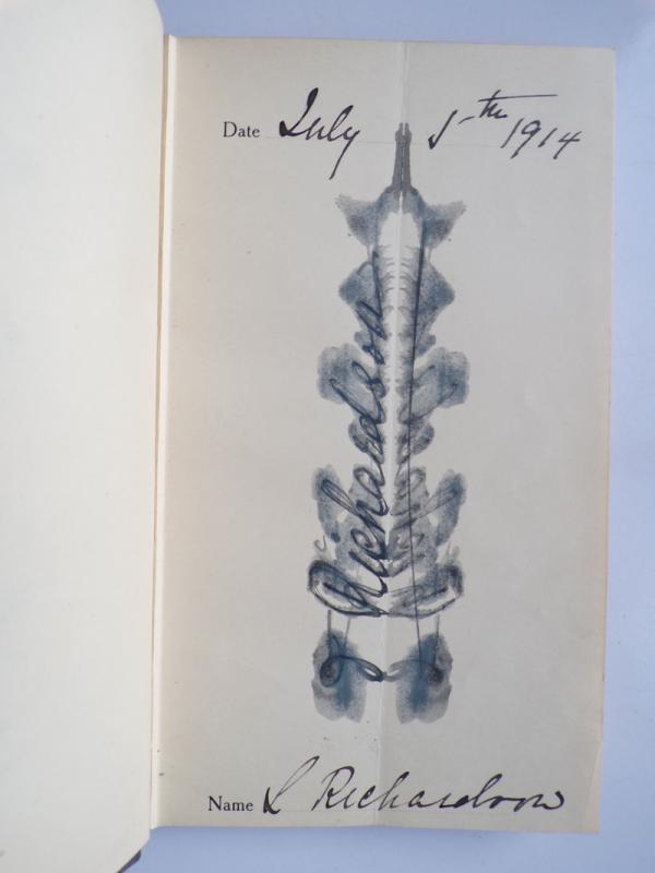 The Ghosts of My Friends, was a popular Edwardian-era novelty autograph book and Parlor game where participants create inkblot "ghosts" from their signatures. The book was designed as a playful twist on the popular autograph albums of the early 1900s, blending the hobby of autograph collecting with the contemporary fascination with spiritualism. Participants use a fountain pen and sign their name in wet ink along a vertical crease or fold in the page. The page is then folded back upon itself, blotting the signature to create a symmetrical, Rorschach-like inkblot image, which resembles a "ghost" or some other figure, such as an insect or a frog. The book consists primarily of blank pages made from a paper suitable for blotting, which a number might be filled with unique signatures and their resulting "ghosts"