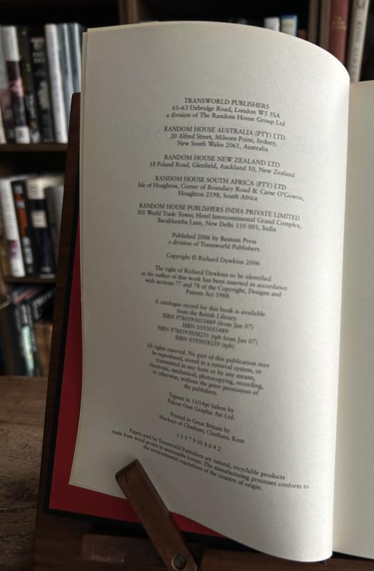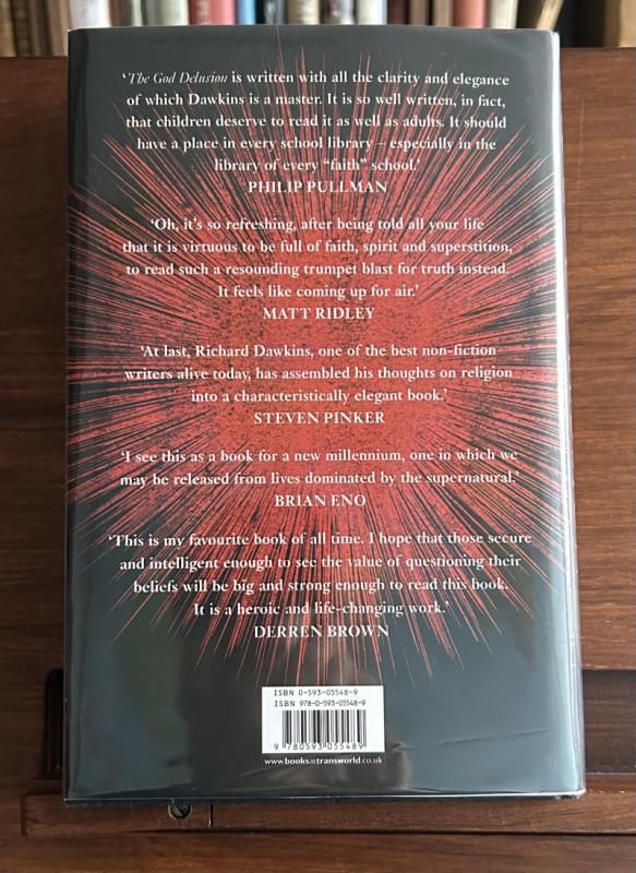 The God Delusion, Richard Dawkins, Bantam Press, 2006, First Edition, First Impression Reaching number four in the New York Times Hardcover Non-Fiction Best Seller List in early December 2006 and translated into thirty-five languages, Dawkins argues, in this book, that a supernatural creator, God, does not exist and that belief in a personal god qualifies as a delusion. The book is in fine condition. The binding is straight and tight, the boards clean and the lettering on the spine bright. The end papers and pages are free from marks, tears and inscriptions. The unclipped dust jacket, protected in a clear, removable cover is in fine condition with no issues. It is becoming increasing rare to find this book as a first / first, especially in such good condition. Will be dispatched carefully wrapped in bubblewrap and a cardboard box.