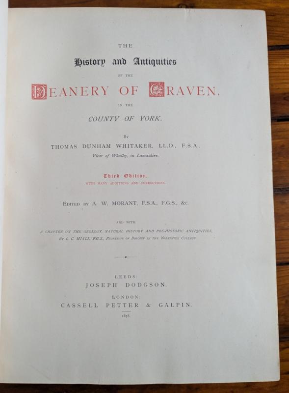 Hardback. Original tan half Morrocco binding with raised bands and gilt lettering. This is the more extensive third edition of this detailed and important history of Craven in Yorkshire, containing around 90 additional pages of texts plus additional plates including ones of Skipton Castle, Sawley Abbey and Kirkstall Abbey. Craven encompasses parts of Airedale, Wharfedale and Ribblesdale including the towns of Skipton, Settle, Slaidburn, Bingley, Keighley, Ilkley as well as settlements such as Gargrave, Mitton and Burnsall. Edited by Alfred William Whitehead Morant and with a chapter on the 'Geology, Natural History and Pre-Historic Antiquities' by Louis Compton Miall, Professor of biology in the Yorkshire College (now University of Leeds). xxii, a further 6 unpaginated leaves showing contents and addenda, 655pp. Binding instructions to last page. Plates, some maps / plans, 29 detailed pedigrees plus additional within text illustrations. Marbled endpapers with reinforced gutter.