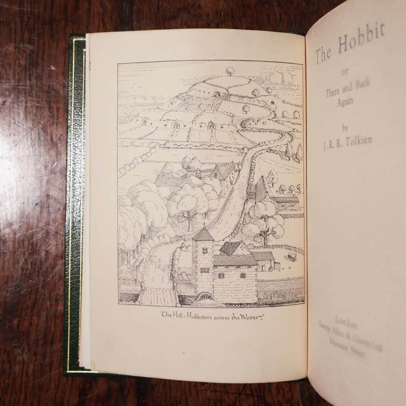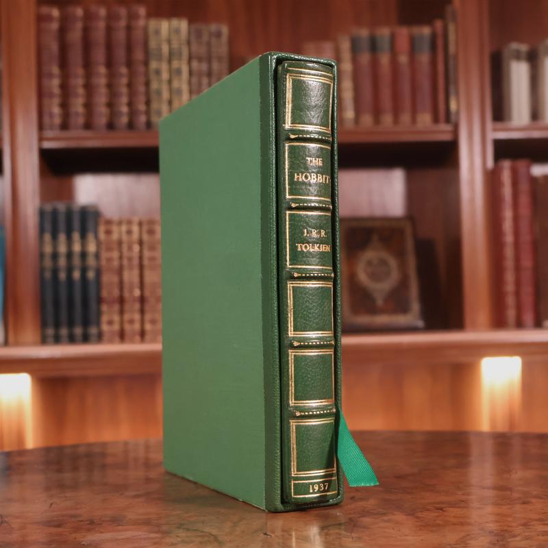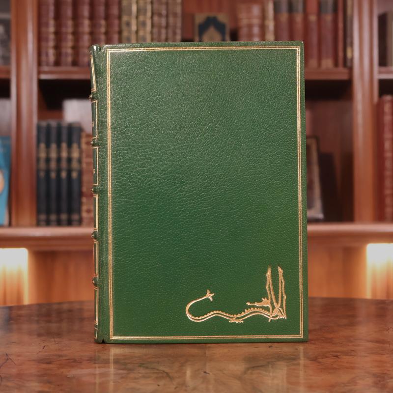 First edition. Octavo. Bound by Bayntun Riviere in full green morocco, with a gilt device of Smaug to the upper cover, double gilt frames to each cover and to the spine compartments, five raised bands and gilt lettering to the spine. All edges gilt. Signed by the binders to the turn-in.