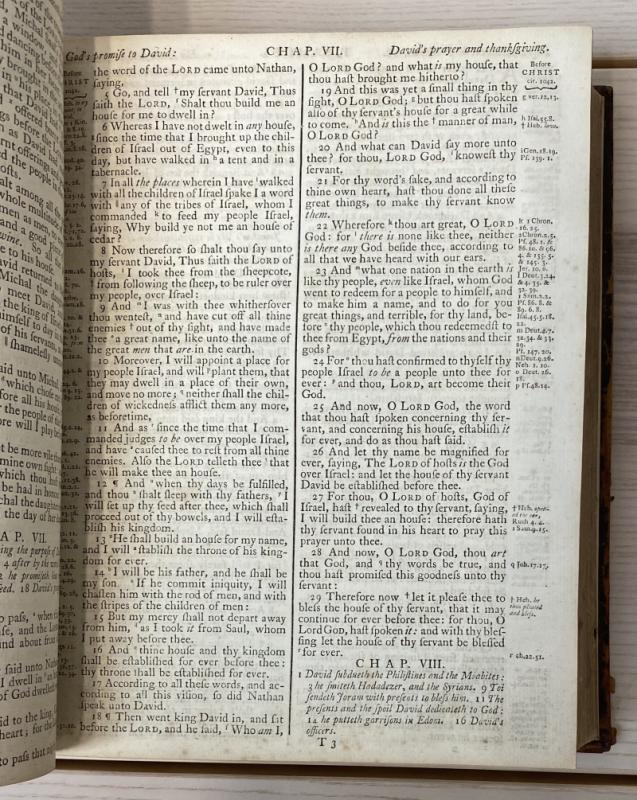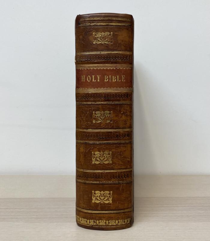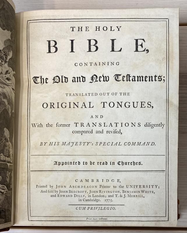 A 1775 Cambridge edition, rebacked but with the original spine and boards. Full mottled calf, gilt bands, borders, decorations and spine label. Neatly rebacked. Some rubbing to the boards, front board with a few light damp spots, extremities a little bumped and worn. Ink spot to the fore edge. Marbled endpapers. Family inscriptions to front blanks. Binding firm with hinges reinforced. Just occasional spots and handling marks to the leaves, which are otherwise bright. Illustrated with an engraved frontispiece. A lovely 18th century family Bible.