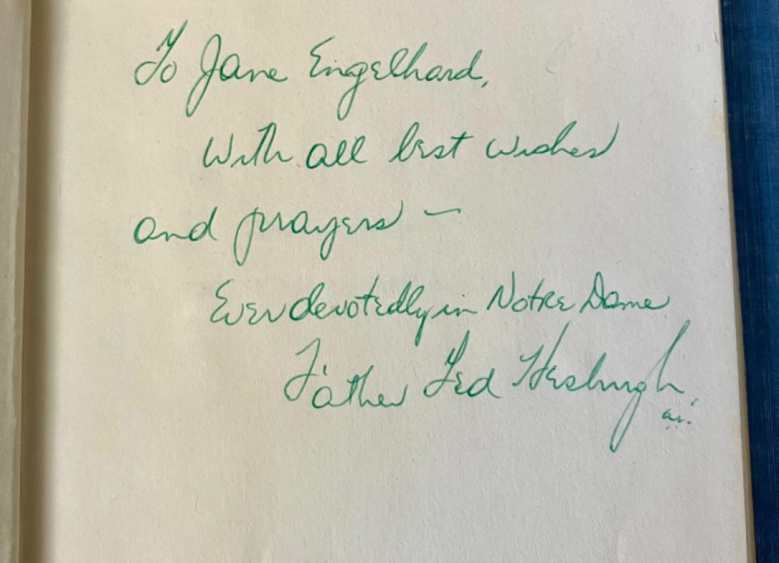 FIRST EDITION. 1st printing. INSCRIBED BY THE AUTHOR on blank front free endpaper. --- To Jane Engelhard, with all best wishes and prayers - Ever devotedly in Notre Dame Father Ted Hesburgh. --- 8vo. (8.2 x 5.4 inches). A very good copy in lightly rubbed dustwrapper. Housed in a blue cloth chemise and blue morocco spined slipcase with raised bands. Compartments with dark blue box designs and lettered in gilt. Cloth on boards. The spine of the slipcase is a little faded but still in very good condition, with the gilt still very bright. A very good copy with a warm inscription from Hesburgh, a constant and powerful figure in the civil rights movement for over 50 years.