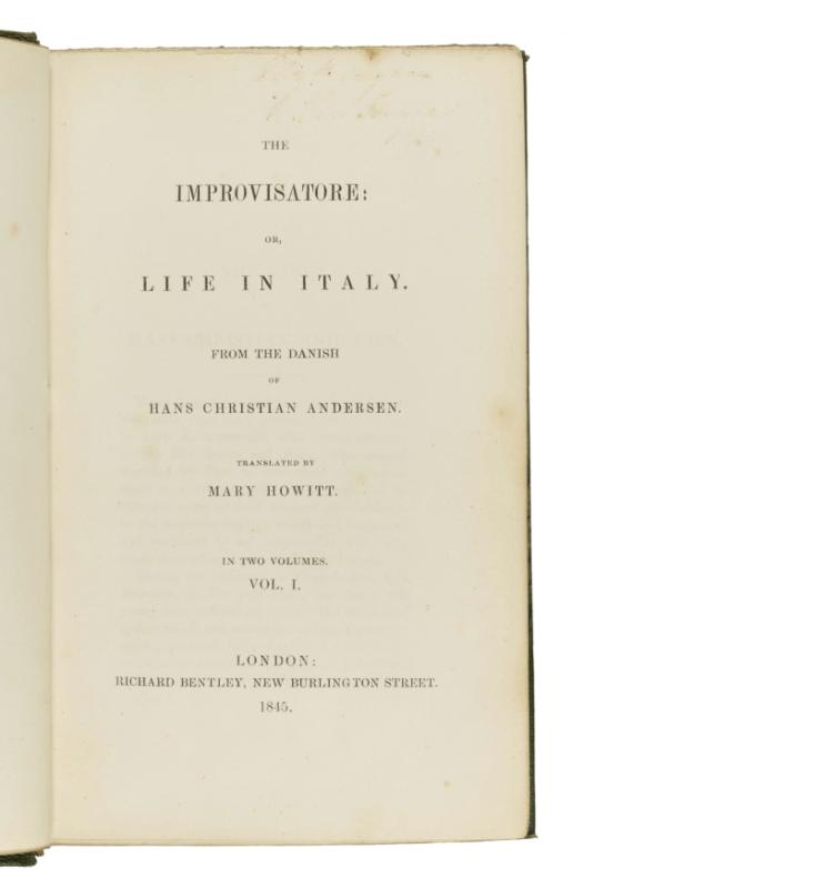 Improvisatore, 1835. FIRST ENGLISH EDITION. Wolff 138. Vol. I has a 2pp ALS tipped into the prelims, from the bookseller Frederick H. Hutt, Strand, advising Mr Blount on prices for Andersen’s works in translation. Dated Feb. 1901, it lists eight titles, including Only a Fiddler, 1845, 5/6. Vol. II has a b&w postcard of The Blue Grotto, Capri, pasted on to initial blank.