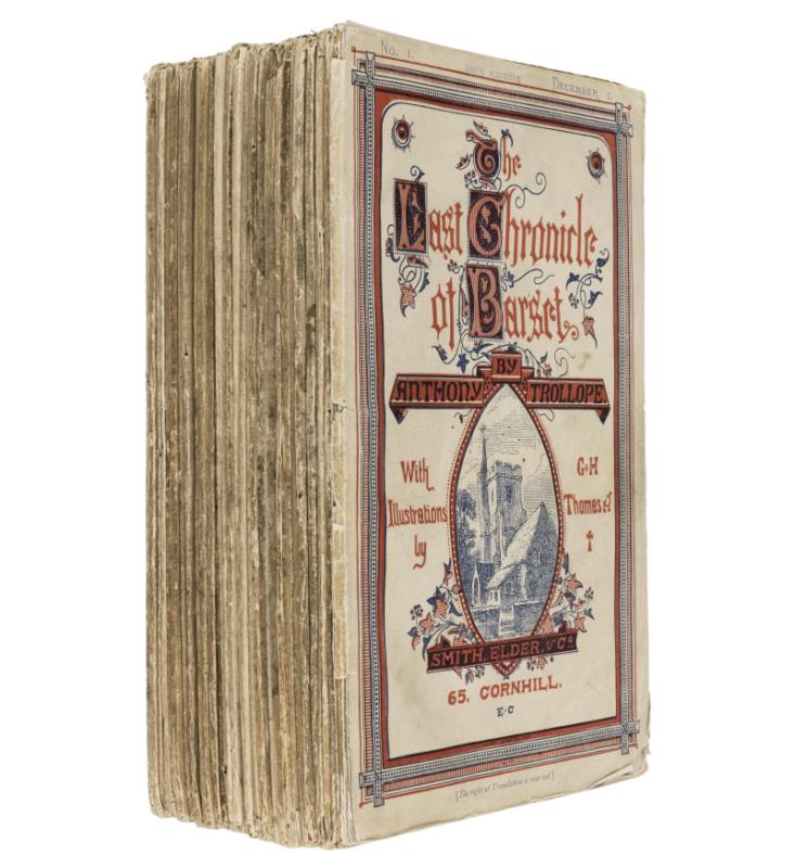 Sadleir (Trollope) 26. Issued between December 1866 and July 1867, this was the last of the Barsetshire Chronicles, and the only one to be issued in parts. Each part was issued with one full-page plate and one vignette. The first book edition appeared in two volumes in 1867. The parts are paginated for two volumes, with the titlepage and contents leaf for Vol. I bound at the end of the 16th number, and those of Vol. II at the end of the 32nd number.