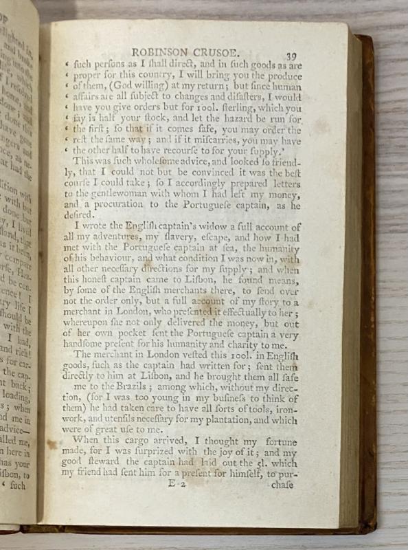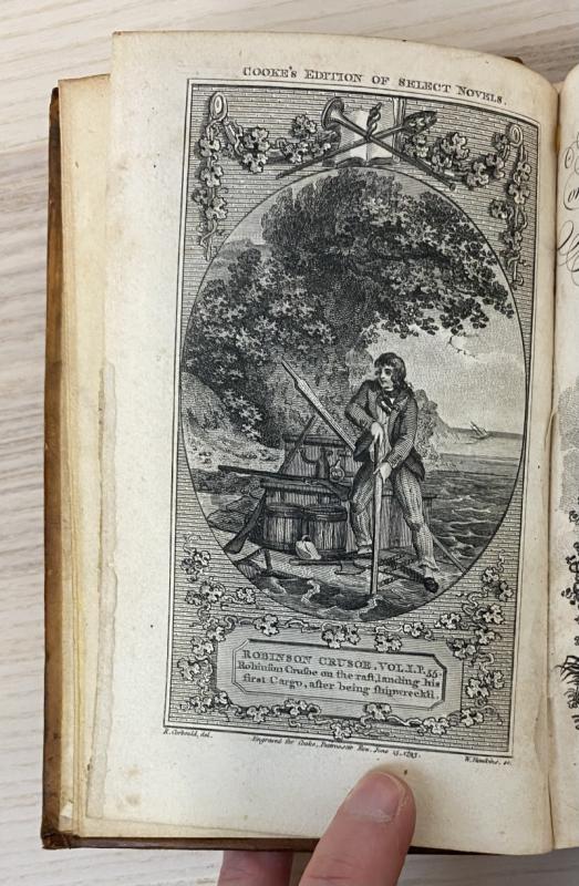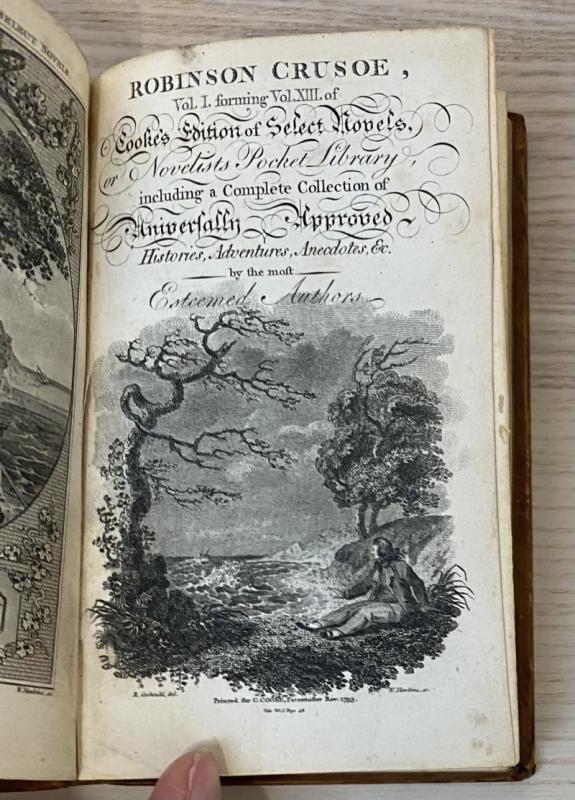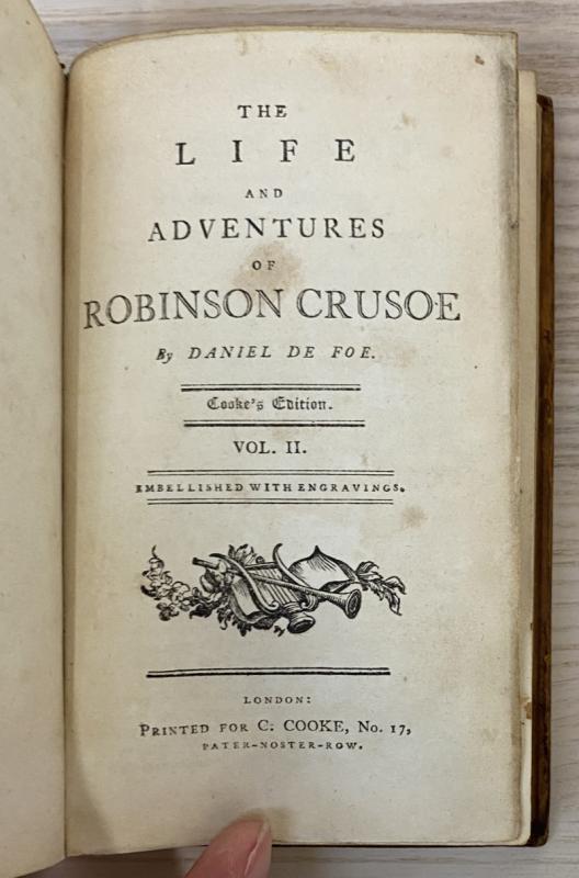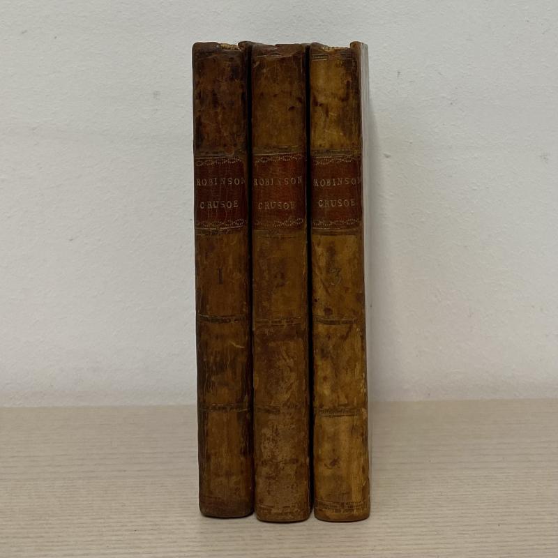 From the 1793 Cooke's Edition of Select Novels, or Novelists' Pocket Library. This work complete in three volumes. Bound in full tree calf, original morocco gilt spine labels to each volume. Illustrated with six engraved plates, each volume also complete with engraved half title page. Externally smart, with just light bumping to the extremities and spine ends, occasional light rubbing to the boards, spines just a touch dried. Half title and title page loose but present to first volume. Bindings remaining generally firm. Some light foxing throughout, with some grubby handling marks to early leaves of second volume. A smart late 18th century example of Defoe's enduring classic.