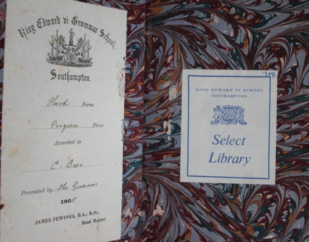 Hardback. Full leather binding in blue with raised bands to spine, red label with gilt titles in the second compartments and gilt decorations to the remaining compartments. Trailing foliage border in gilt to both upper and lower boards and again to edges of the boards. Blind impressed details to the leather margin around the endpapers. Endpapers and closed page edges are marbled. Black and white frontis by W. S. Stacy. No date but prize label dated 1905 and presented to C. Beer with further label showing C. Beer presented the book back to the school in 1961.