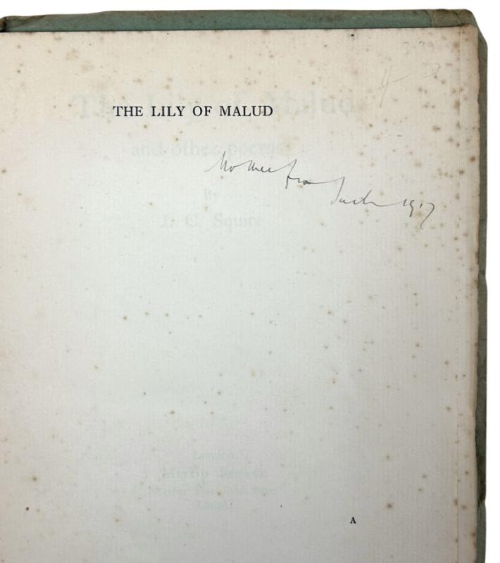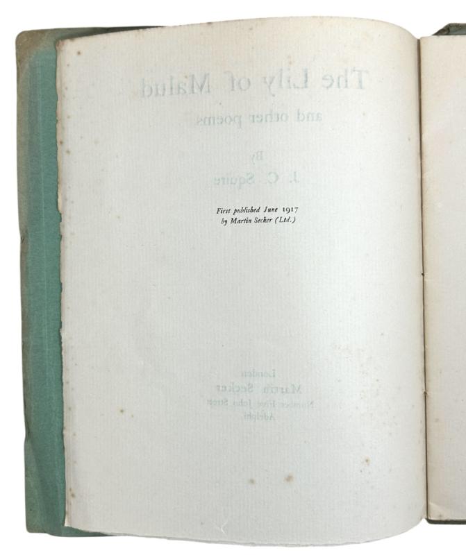 London: Martin Secker, 1917. First edition, first printing. This is a very good copy. Softcover, in green paper wraps. These suffer from some toning at the edges (notably on the verso) and some moderate shelf wear. The preliminaries are slightly foxed. To the front fly leaf, Squire inscribes ‘Mother from Jack 1917’ in black ink. Overall, this is a very good, intimate copy.