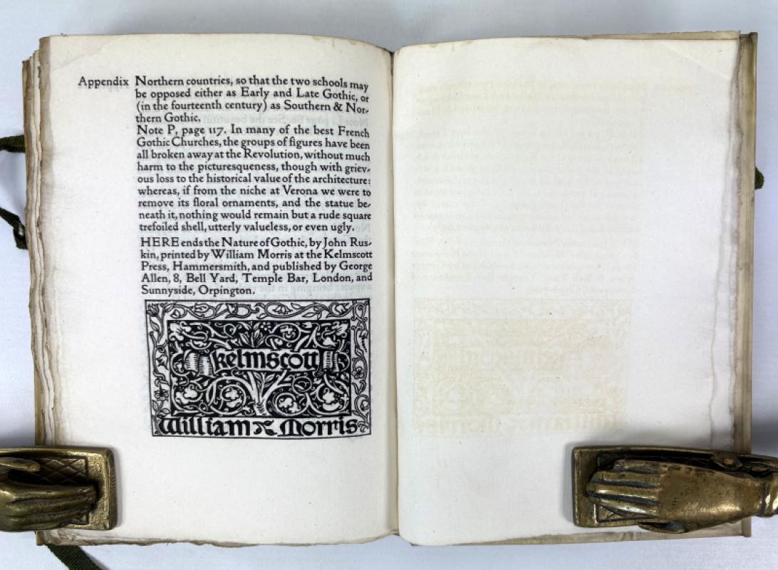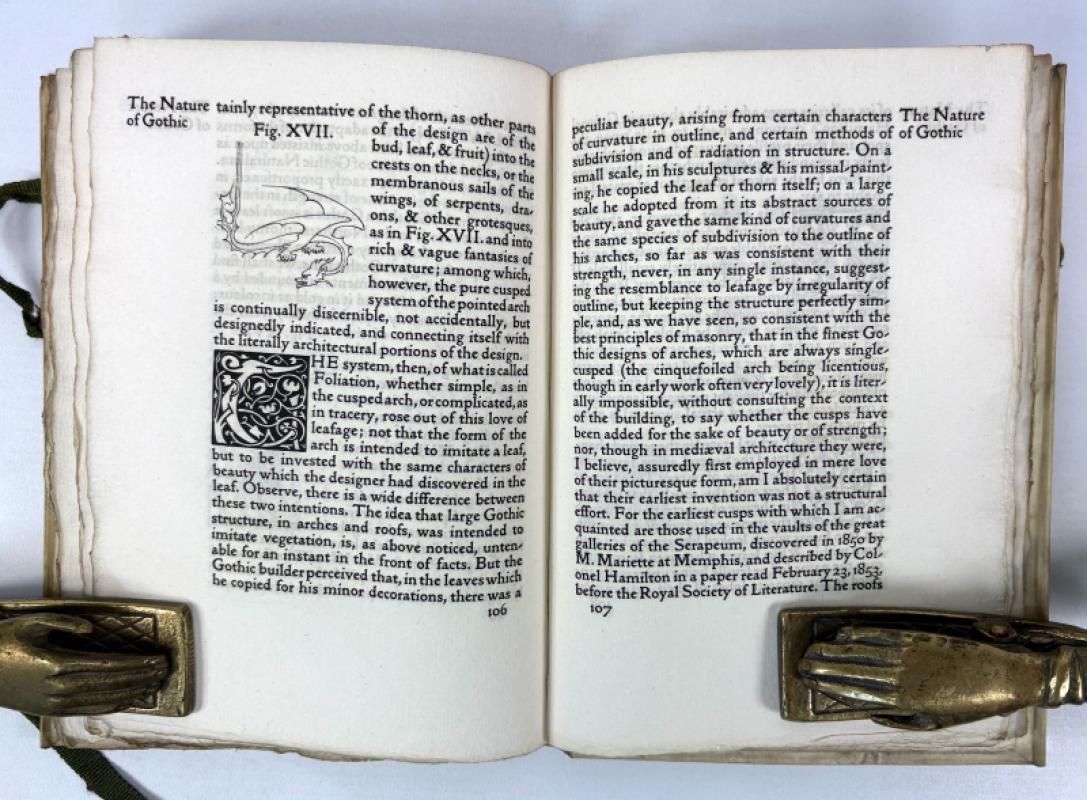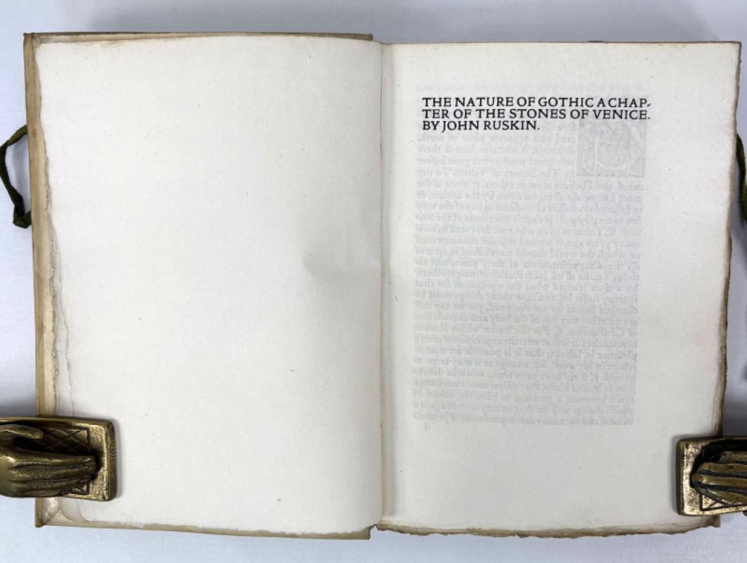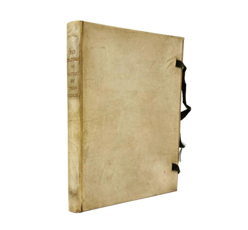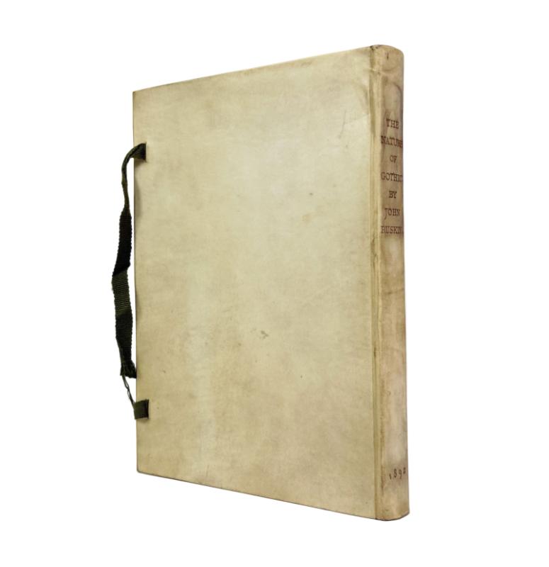 A landmark in both printing and aesthetics, The Nature of Gothic forms a key chapter from John Ruskin's The Stones of Venice and embodies his passionate argument for the moral and spiritual value of medieval craftsmanship. This 1892 Kelmscott Press edition, printed under the direction of William Morris, is among the press's most celebrated productions - uniting Ruskin's visionary prose with Morris's ideals of beauty, labour, and design. Printed in Golden type on handmade paper, it features exquisite decorative borders and initials designed by Morris, and is bound in full vellum with its four original green cloth ties still present. A fine expression of the Arts and Crafts movement's reverence for honest workmanship and the unity of art and life.