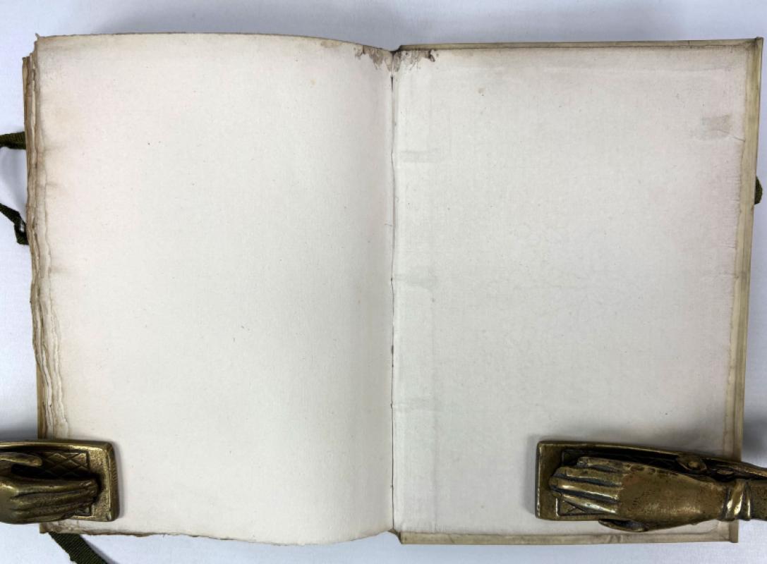 There are a couple of small marginal stained areas near the top of the endpaper/pastedown pages.
