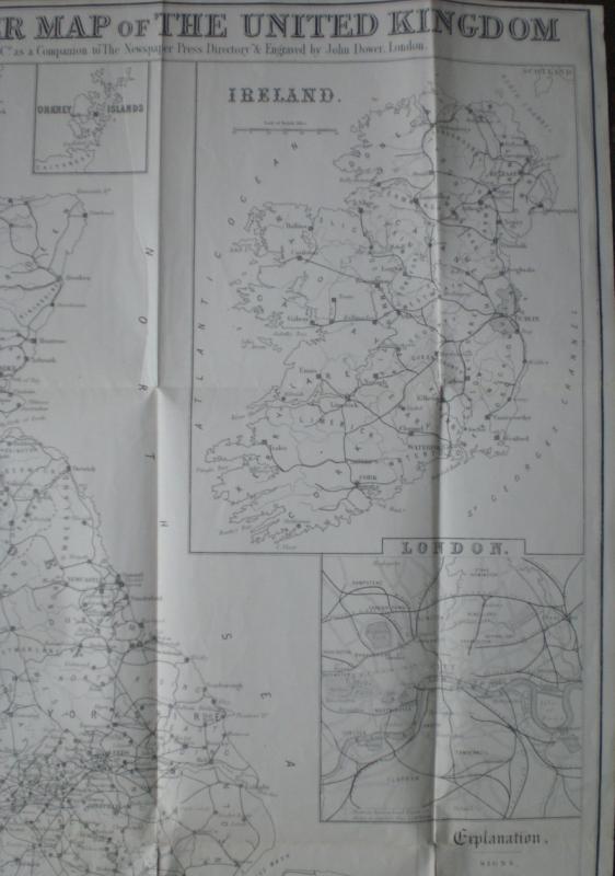 The Newspaper Map of the United Kingdom, engraved by John Dower and designed by C Mitchell, published London 1872. On folding paper size 76 by 56 cm. Uncoloured. Scale twenty miles to the inch. Includes inset maps of London; Ireland; the Orkneys and the Channel Islands. Shows the distribution and variety of newspaper publication in the UK. A key has symbols that give an explanation of towns with one paper, more than one paper, and daily and weekly papers, plus railways, industry, agriculture etc. Strengthening to folds at reverse with archival quality clear tape. Good to VG condition.