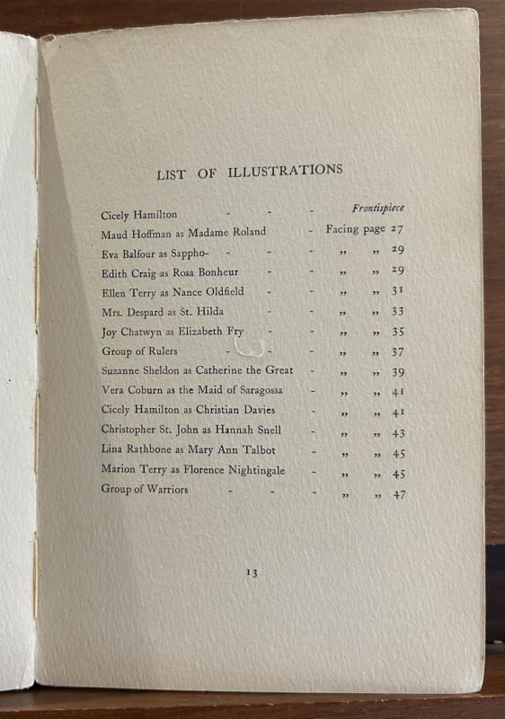 The book contains the script of the play and fifteen photos of suffragists and actresses in costume as the great women of history together with 52 short biographies at the rear and was sold to raise funds for the cause.