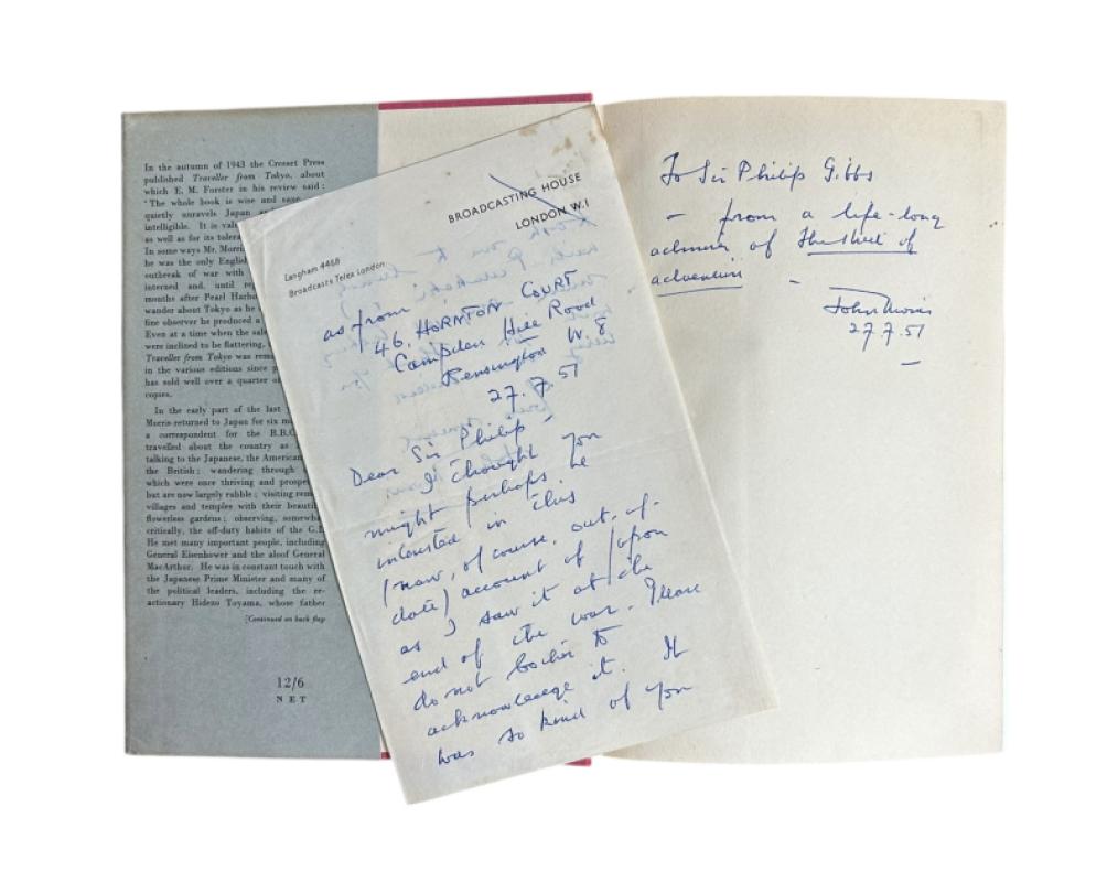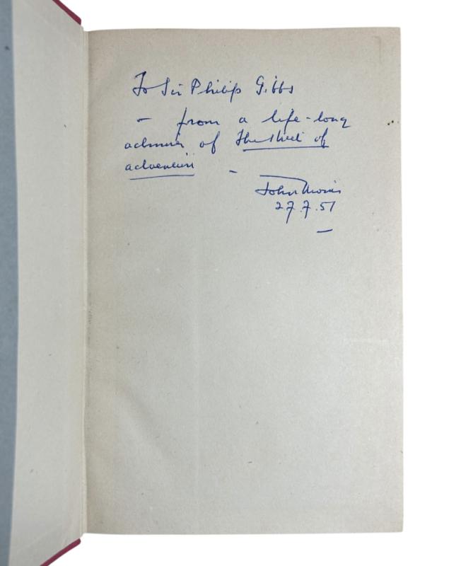 London: The Cresset Press, 1947. First edition, first printing. This is a very good (or better) copy. The dust jacket is a touch toned at the spine and very sparsely (and very faintly) foxed. It has not been price clipped (12/6 net). In the publisher’s magenta cloth as issued, the boards are lightly bumped at the corners and spine tips – there is a touch of staining at the bottom edge. The text blocks, though mostly clean, are with some spots. John Morris has inscribed this copy to Sir Philip Gibbs in blue ink on the front flyleaf: ‘To Sir Philip Gibbs | – from a life-long | admirer of The Street of | [a]dventure | - John Morris | 27.5.57’. This wonderful inscription not only shows admiration from Morris’s part, but acknowledges Gibbs’ The Street of Adventure (1909). It is accompanied by a handwritten letter, also addressed to Sir Philip Gibbs. On Broadcasting House paper, it reads: