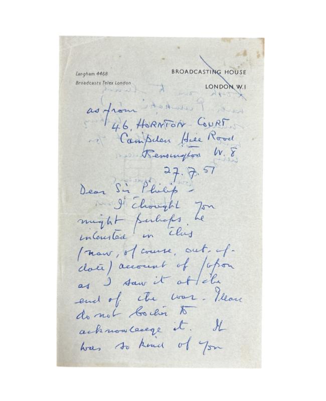 Dear Sir Philip – | I thought you might perhaps be interested in this (now, of course, out-of- | date) account of Japan | as I saw it at the | end of the war. Please do not bother to | acknowledge it. It was so kind of you | to ask me to lunch | with [?] & I | much enjoyed talking | with you. Thank you | very much indeed