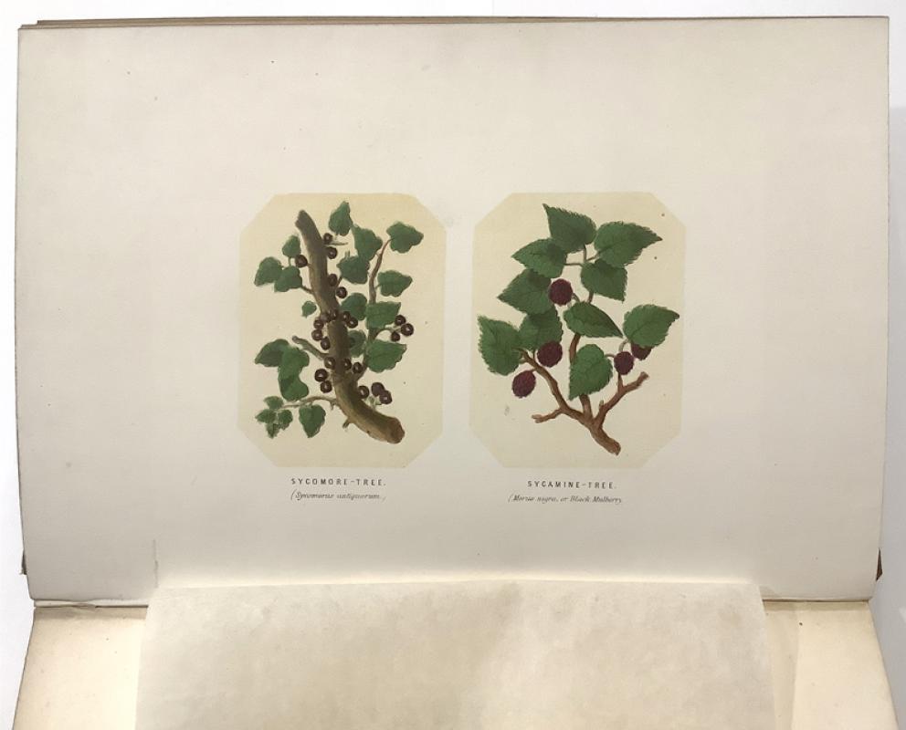 BALFOUR, John Hutton. The Plants of the Bible. Trees and Shrubs. iv, [2], 2, 54pp., half-title., 12 colour lithographed plates depicting 24 trees & shrubs, and several wood-engraved text illustrations. A very good copy in original blind and gilt stamped dark brown cloth, all-edges-gilt.