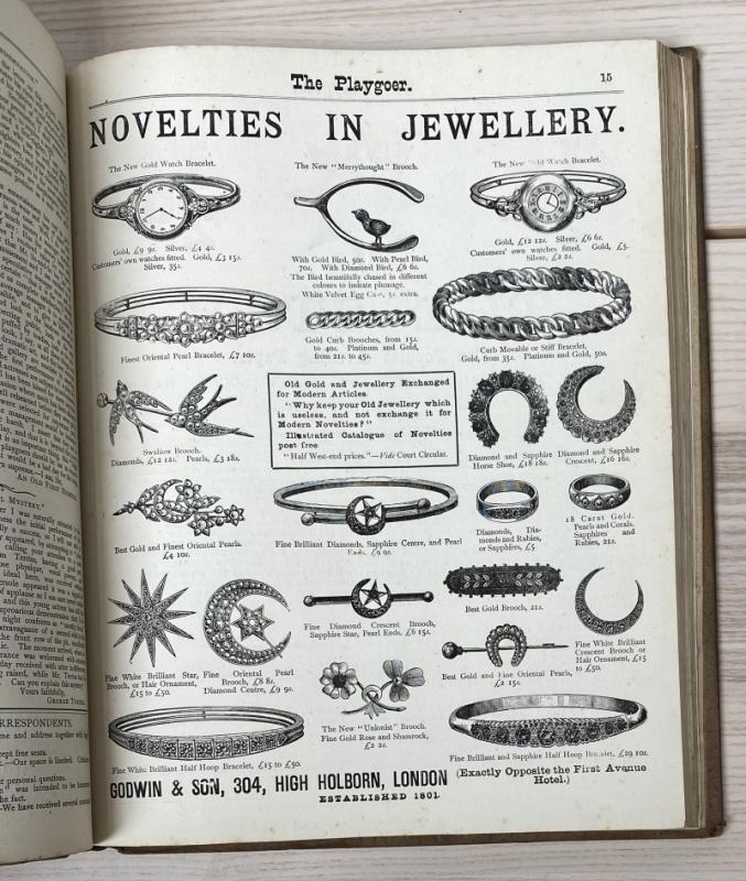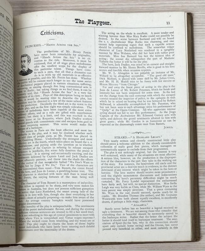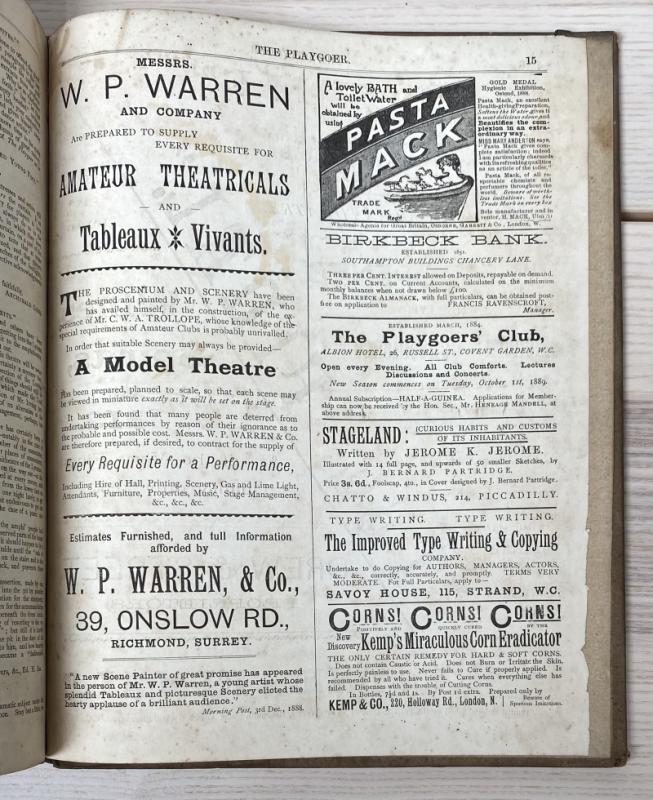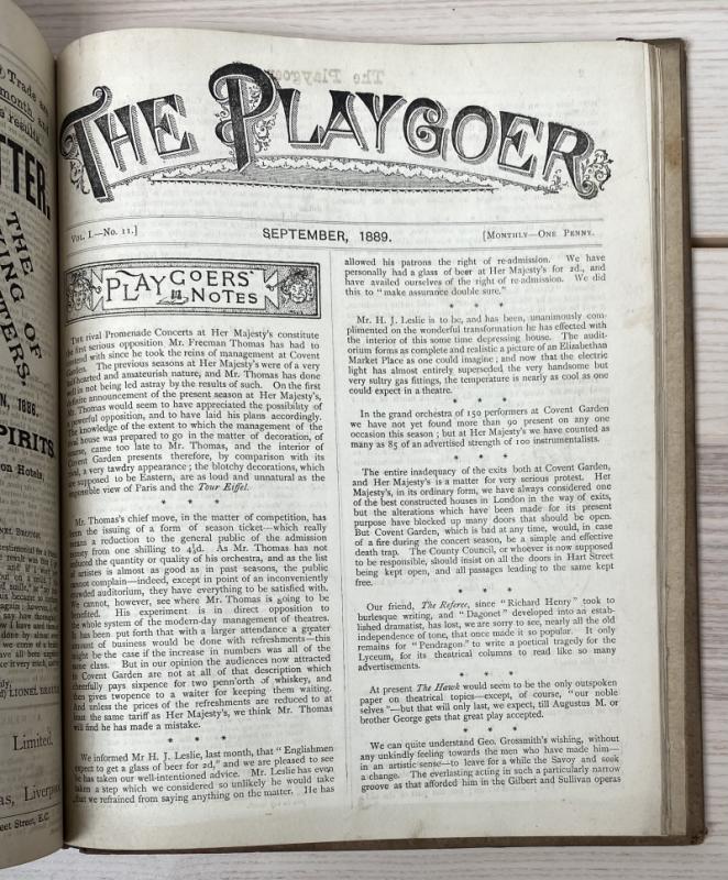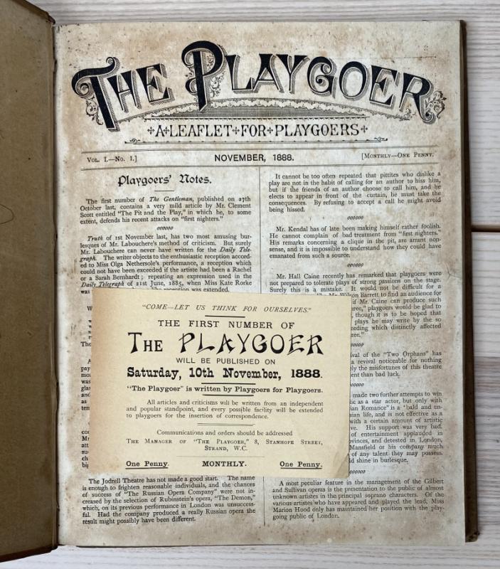 A bound collection of this periodical, complete from Vol I No. I November 1888 through Vol II No. 13 November 1889. Containing play and musical reviews and advertisements for publications relating to theatre. Contemporary quarter cloth and paper covered boards, the extremities bumped resulting in some losses, the head and tail of the spine similarly, boards with occasional marks and toning. Binding remaining firm, the pages with occasional age-toning and a few marks, generally smart. Complete with advertisement slip loosely inserted. A scarce example of this late Victorian periodical, with illustrated advertisements throughout.