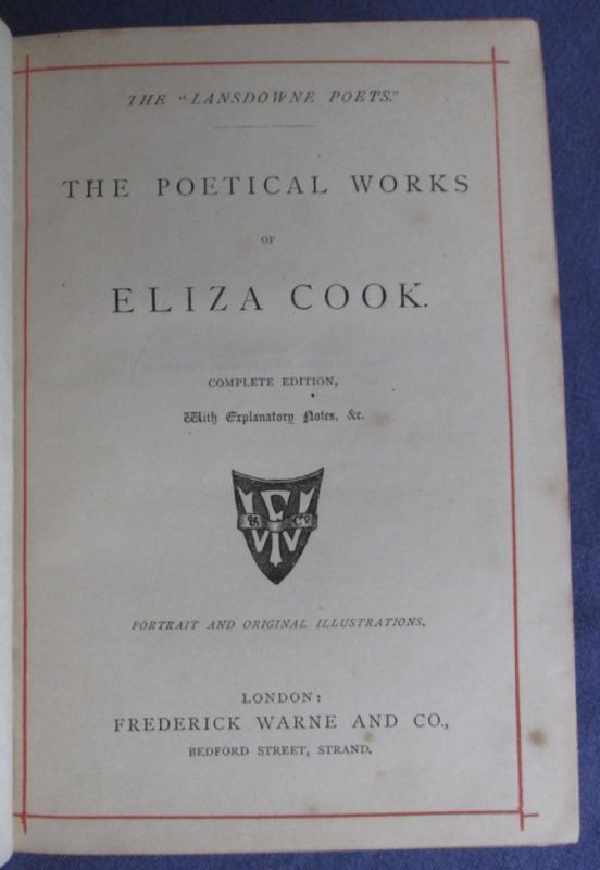 Hardback. Eliza Cook (1818-1886) was a popular nineteenth century poet and was strongly interested in workers rights such as Chartism, and in the importance of education. This complete collection includes poems such as A Song for the Workers on the ‘Early Closing’ movement for shorter working hours. Also includes her poems for children. Highly decorated cloth binding with decorative titles heavily illustrated in gilt. Further illustration in black onto a green cloth binding. Bevelled boards. Gilt to all edges. Black and white frontis portrait. and small number of further black and white plates. Each page decorated with red rulled margins. Very nicely produced edition for the Lansdowne Poets series. Complete edition with notes. xv,624pp.