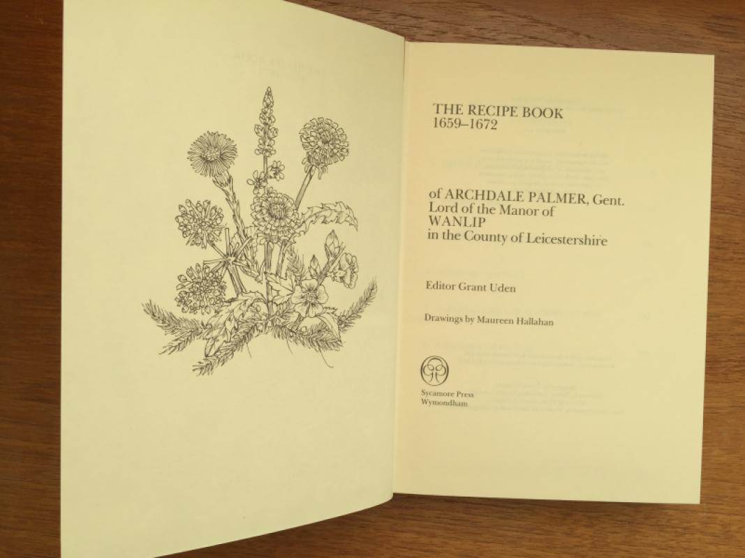 ‘The Recipe Book 1659-1672 of Archdale Palmer, Gent. Lord of the Manor of Wanlip in the County of Leicestershire’ ~ Editor Grant Uden; pub by Sycamore Press, 1985; no 79 of Limited Edition of 250 copies; bound in brown cloth with title on spine in gilt & design on front cover; 8vo, c312pp, few b&w illustr, excellent condition.