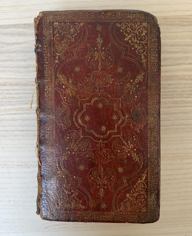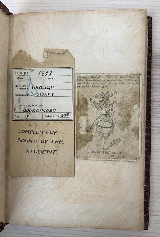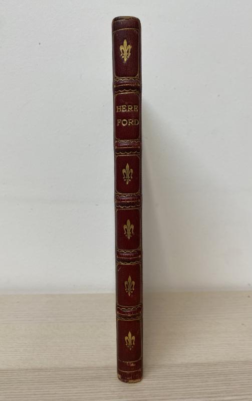 Bound in lovely full red crushed morocco by Sidney Brough. Gilt raised bands, titles & inset Arts and Crafts decoration to front board. Light rubbing to the joints & the tail of the spine, extremities rubbed and a little bumped, a few scuffs and scratches to boards. Gilt dentelles. Complete with tags loosely inserted detailing the student binding. Lacking (bound without) title page, with many publisher's advertisements local to Hereford. Some loss to upper corner of final leaf of advertisement. Internally a little age-toned and some light foxing. In a delightful amateur student binding, with loosely inserted tag dated 1908 & denoting Brough's age as 17, reading 'completely bound by the student'.